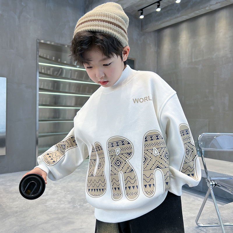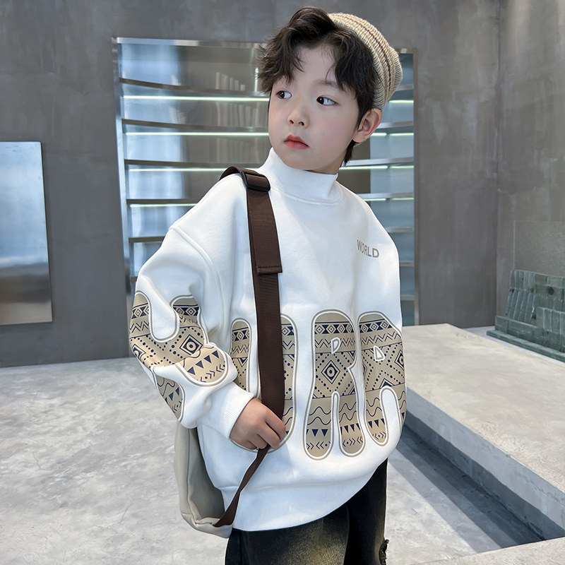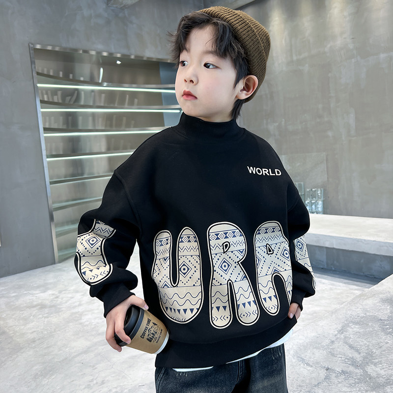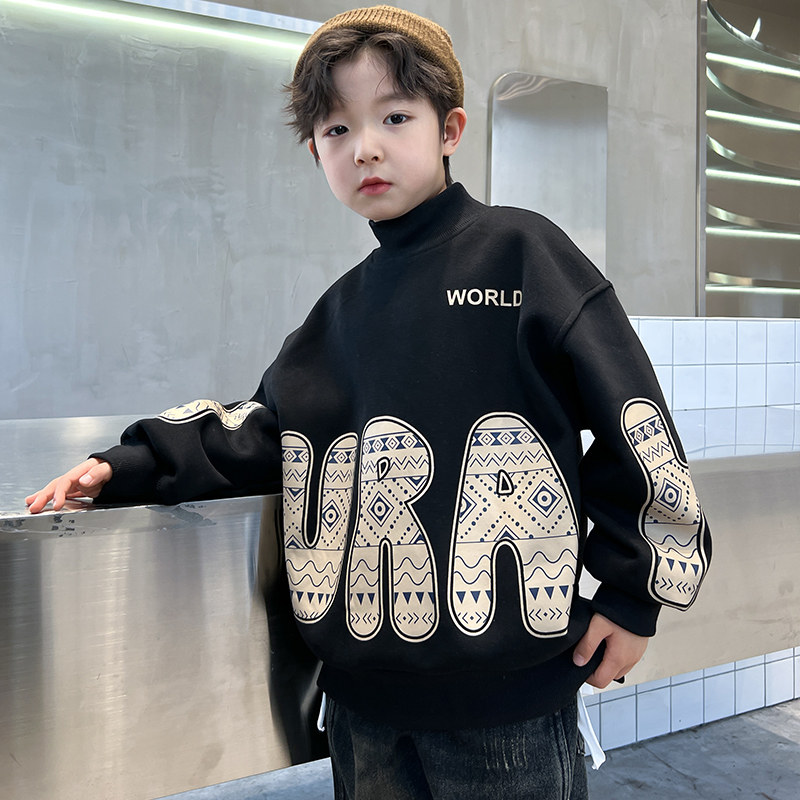 男大童秋冬黑色痞帅半高领加绒卫衣2025新款儿童冬季加厚打底上衣