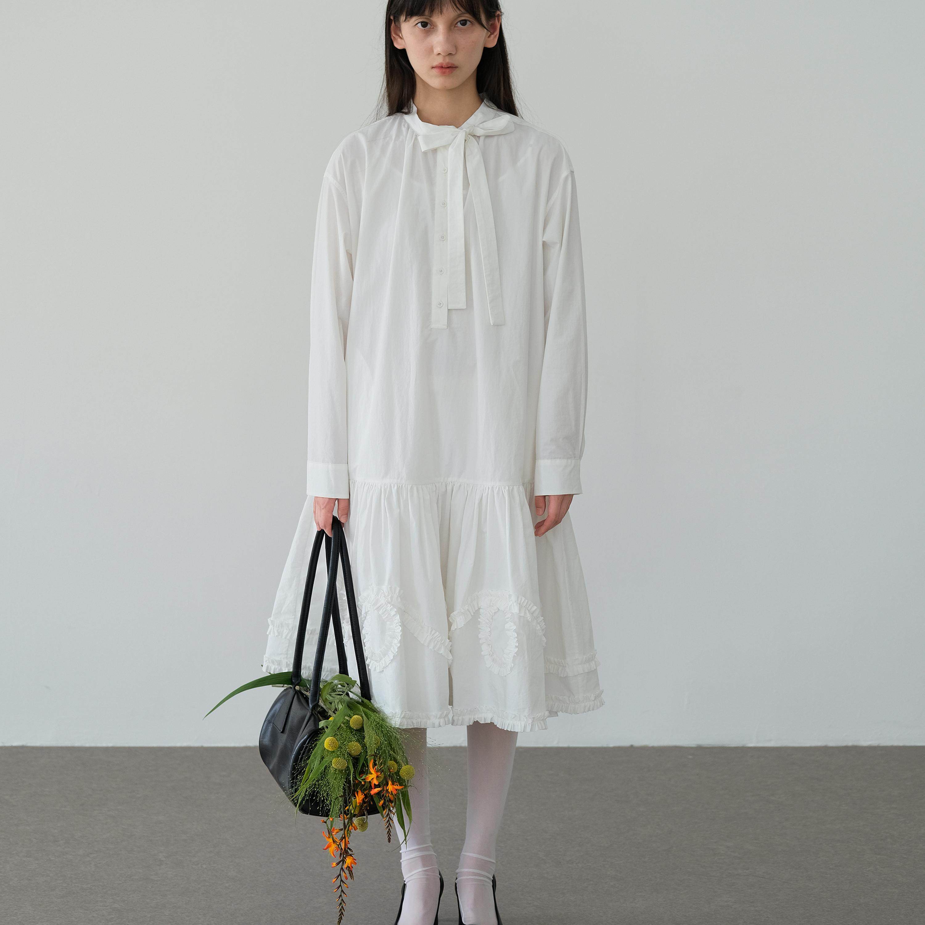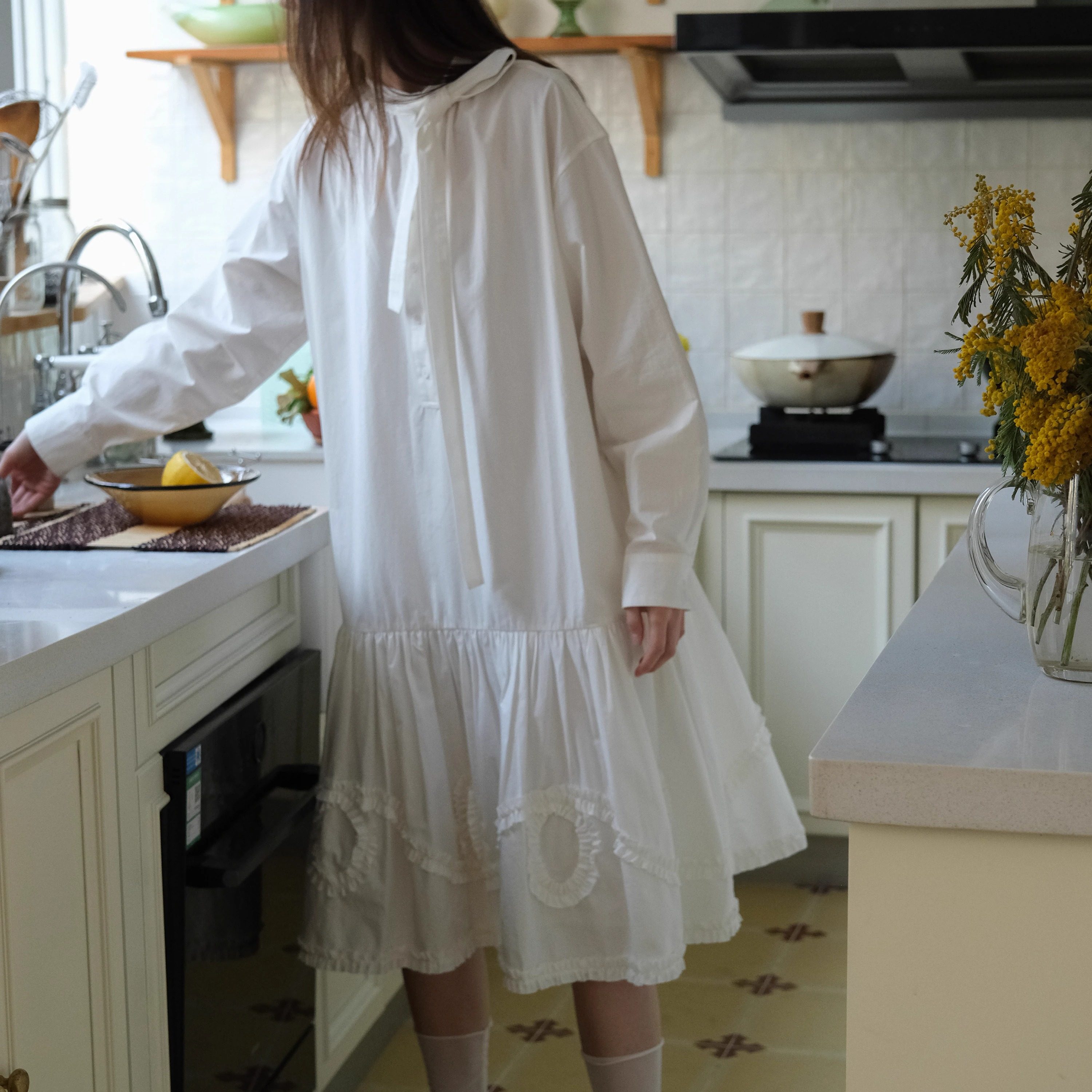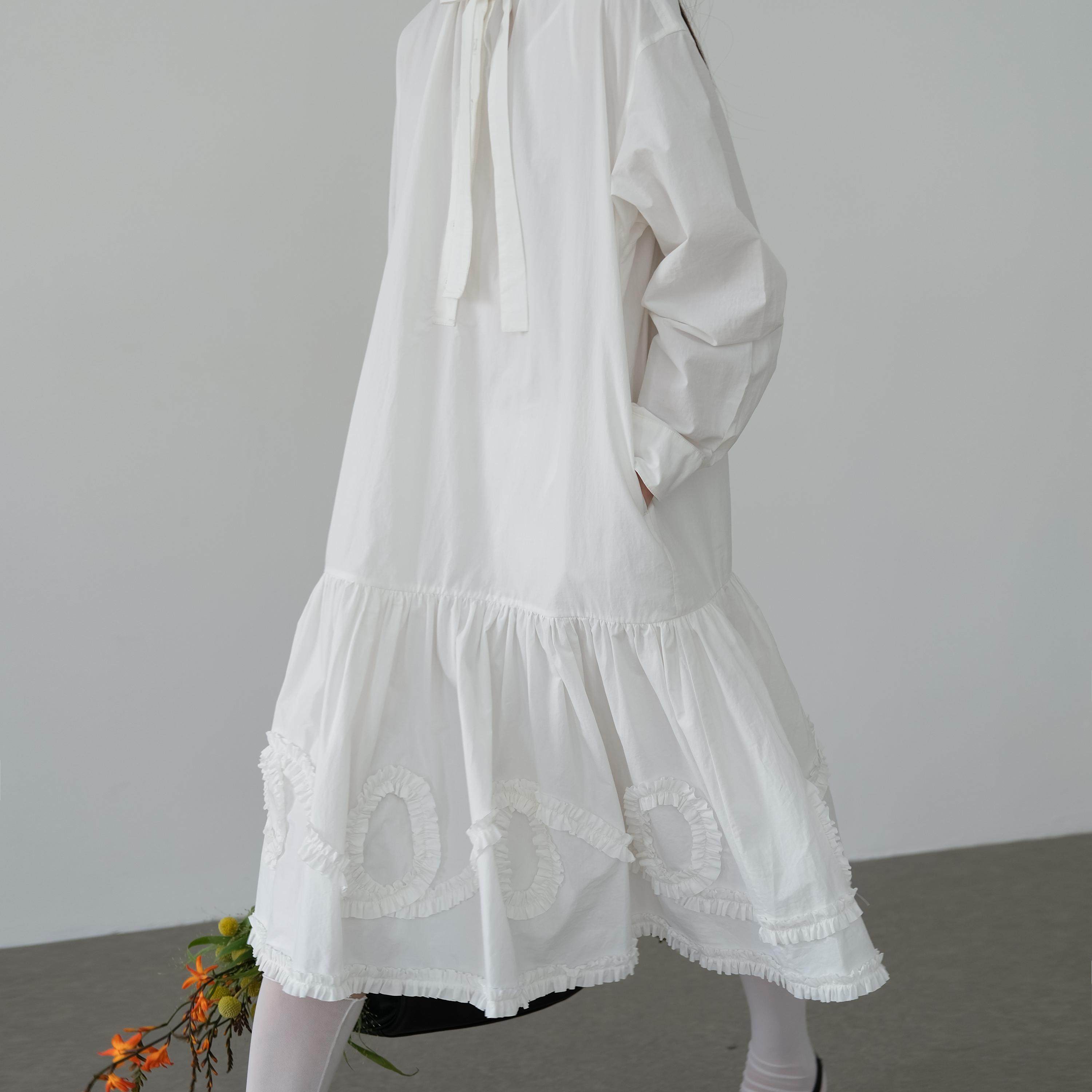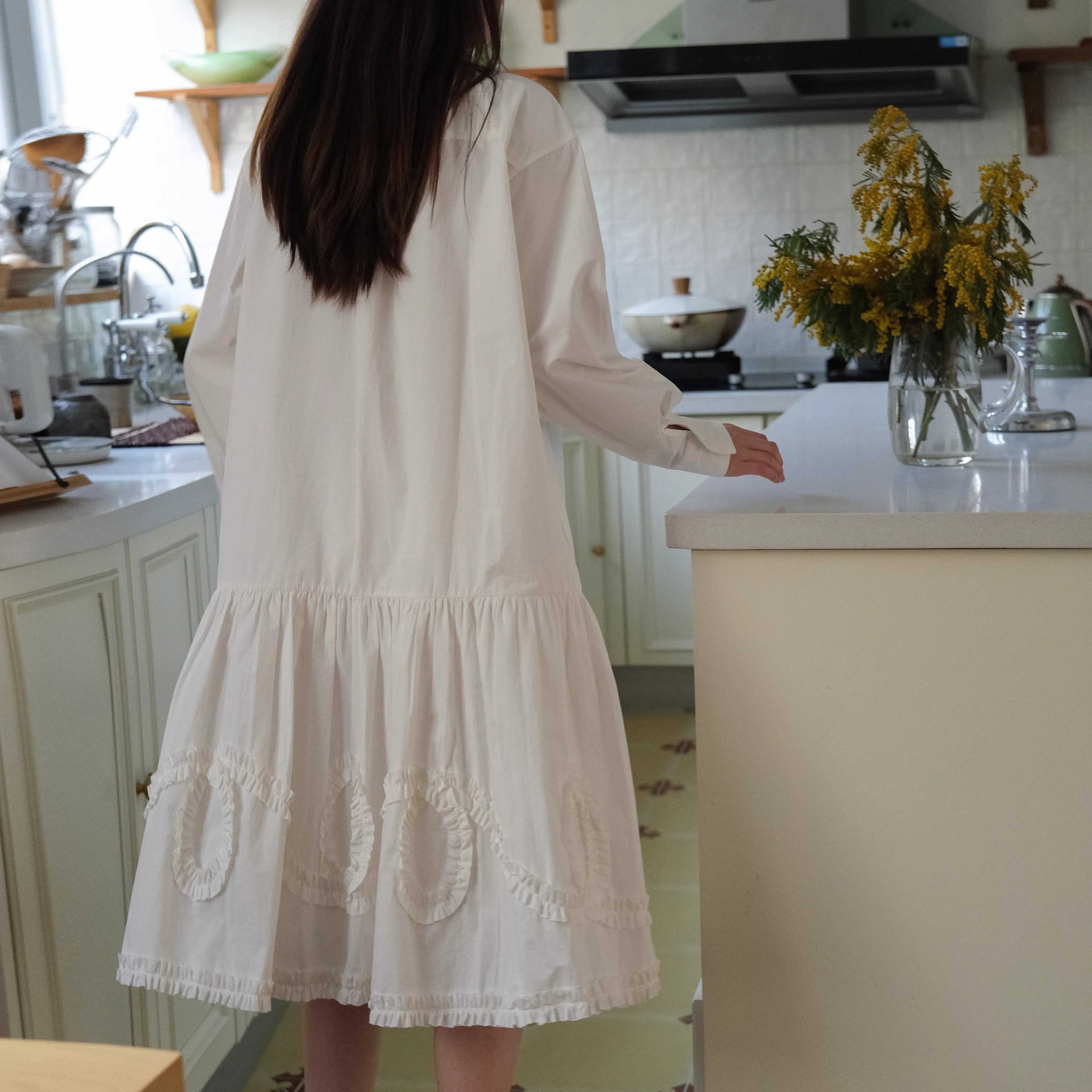 HEROW 水洗棉感 木耳荷叶裙摆重工绞花 白色长袖连衣裙