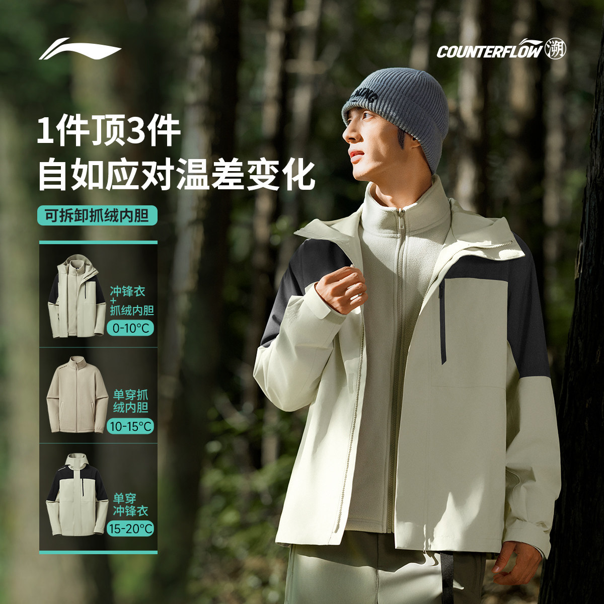 李宁户外CF溯丨万龙甲三合一冲锋衣男女加绒加厚登山硬壳新年外套