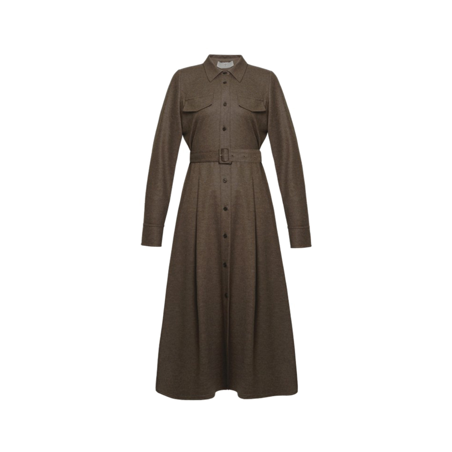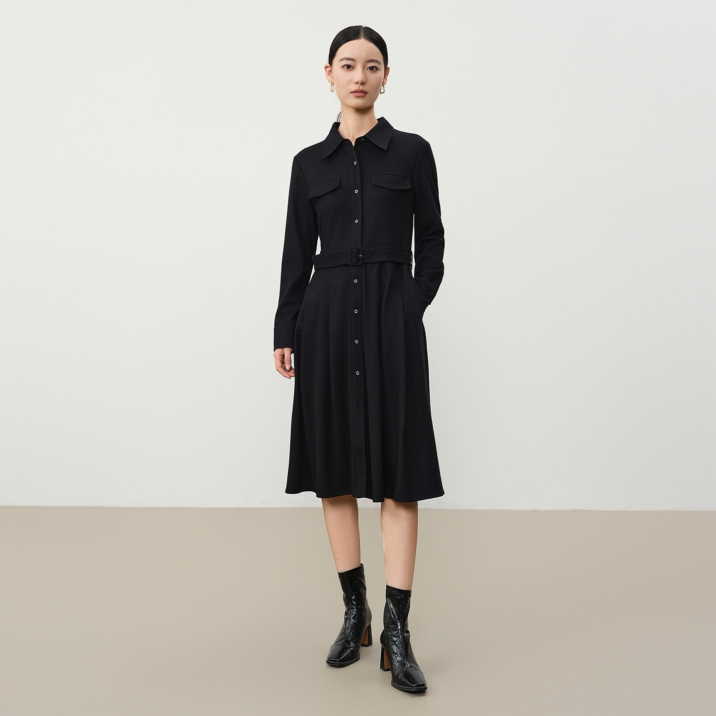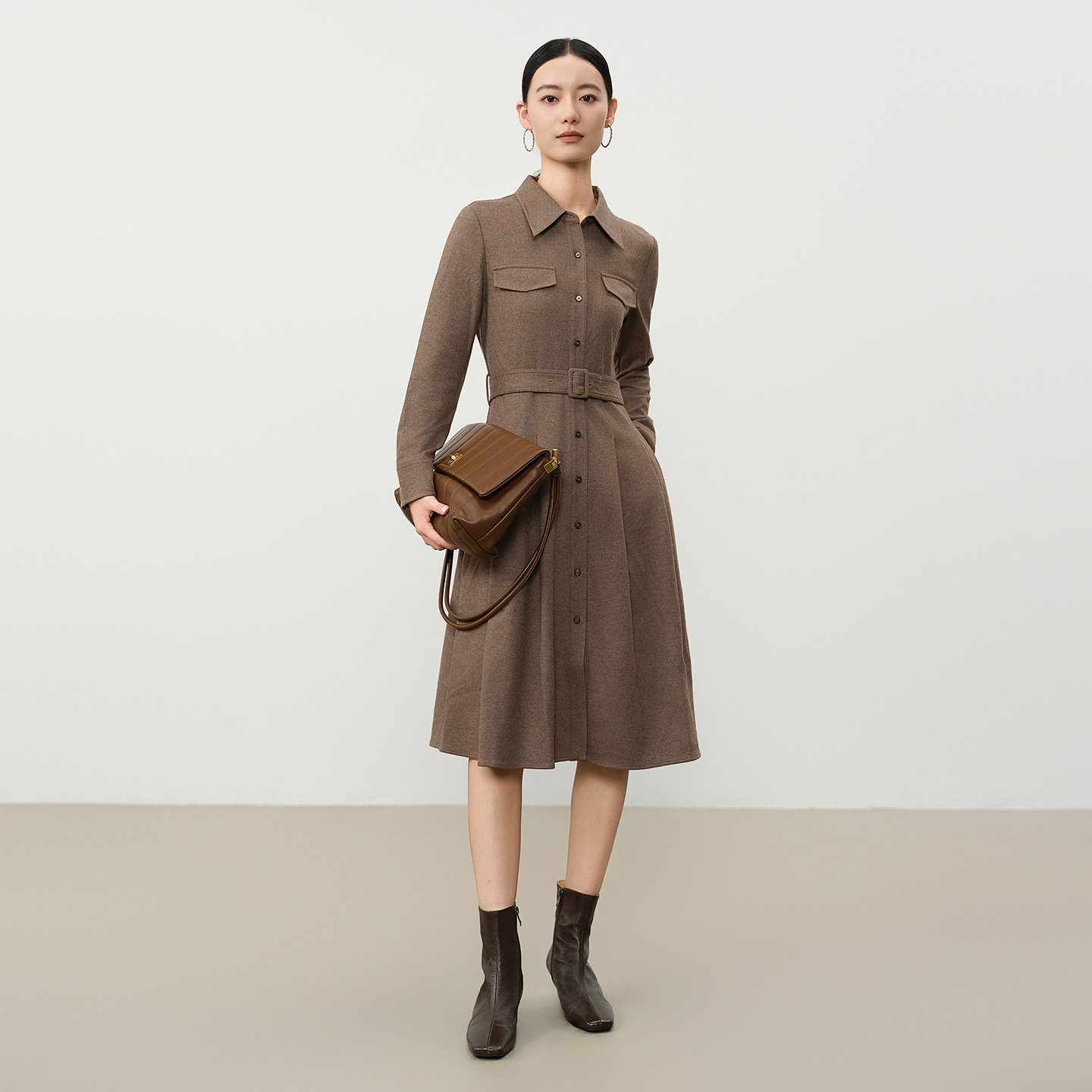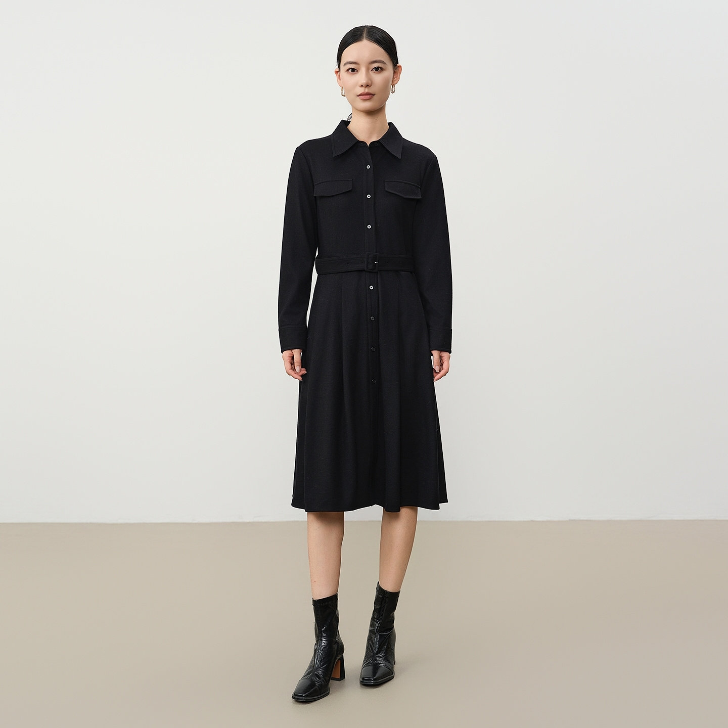 谷邦绵羊毛气质连衣裙女2025冬季新款翻领收腰显瘦中长款A字裙子