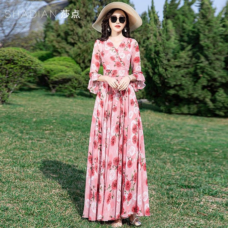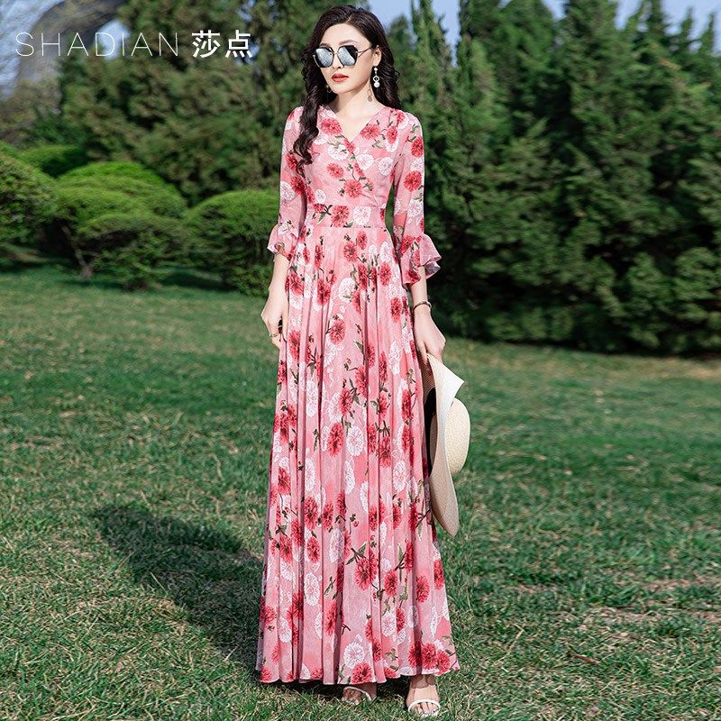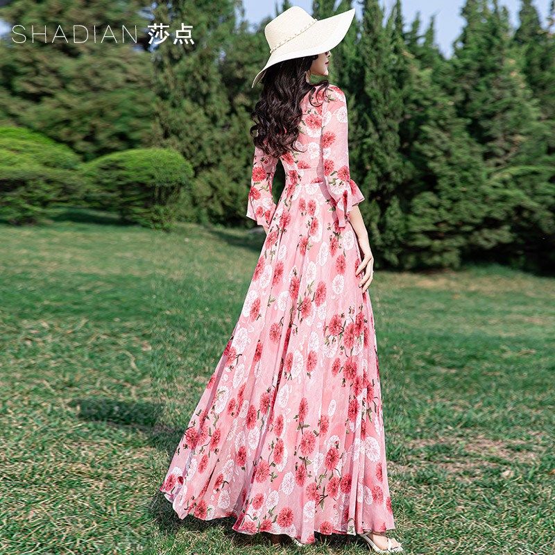 碎花连衣裙女夏长款到脚踝V领长裙夏天雪纺大摆裙海边度假沙滩裙
