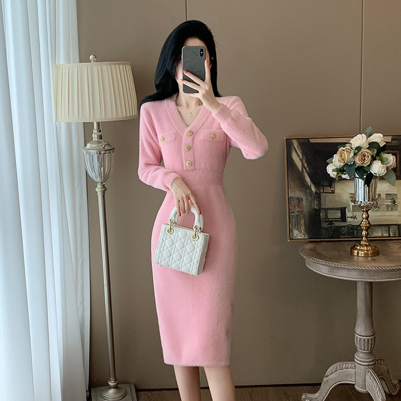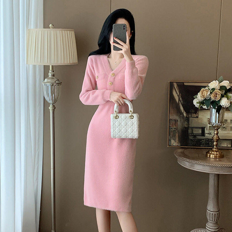 高级感气质粉色针织连衣裙女秋冬季长袖过膝长款V领仿水貂毛衣裙