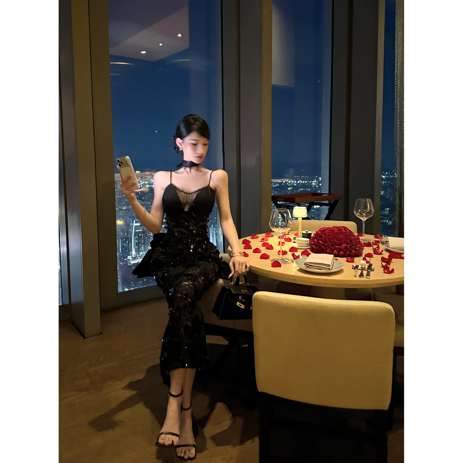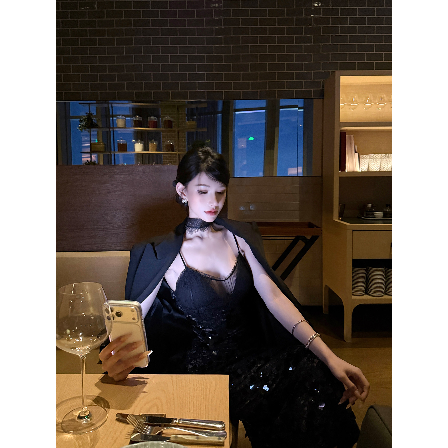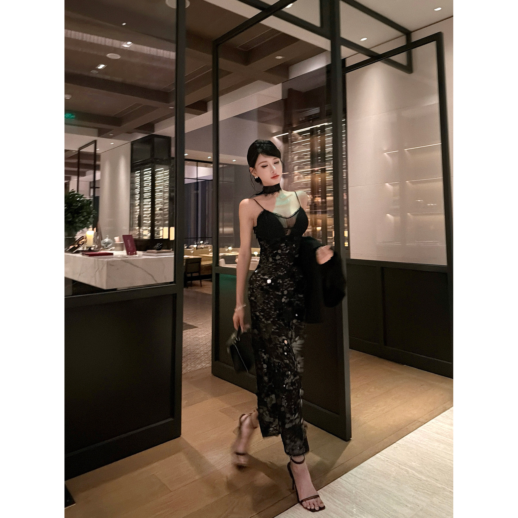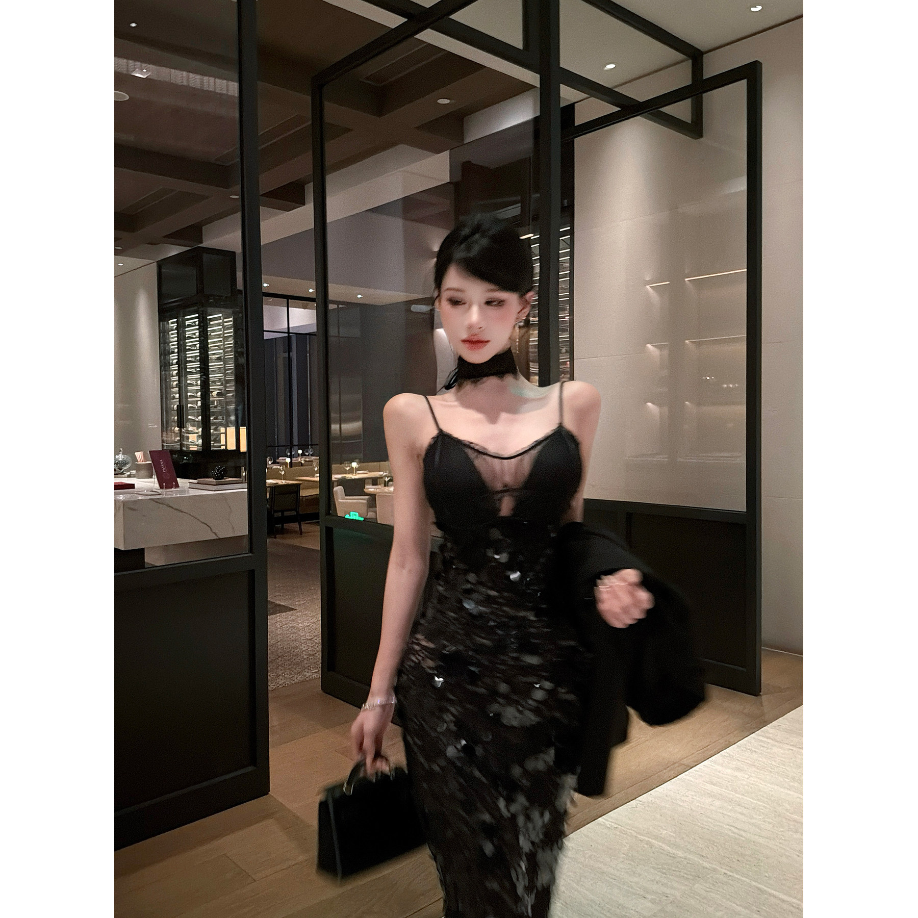 灰尘邓邓 蕾丝吊带连衣裙2025冬季性感亮片包臀长裙黑色开叉裙子