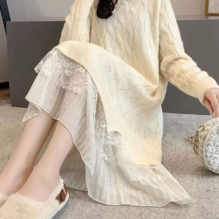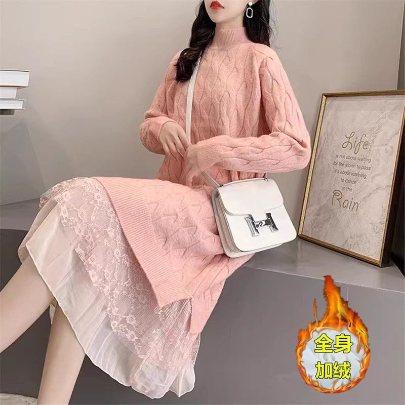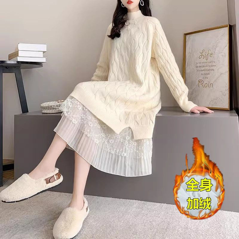 配大衣秋冬新款毛衣裙女中长款过膝宽松加绒加厚打底衫内搭连衣裙