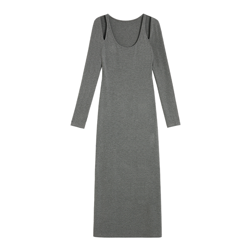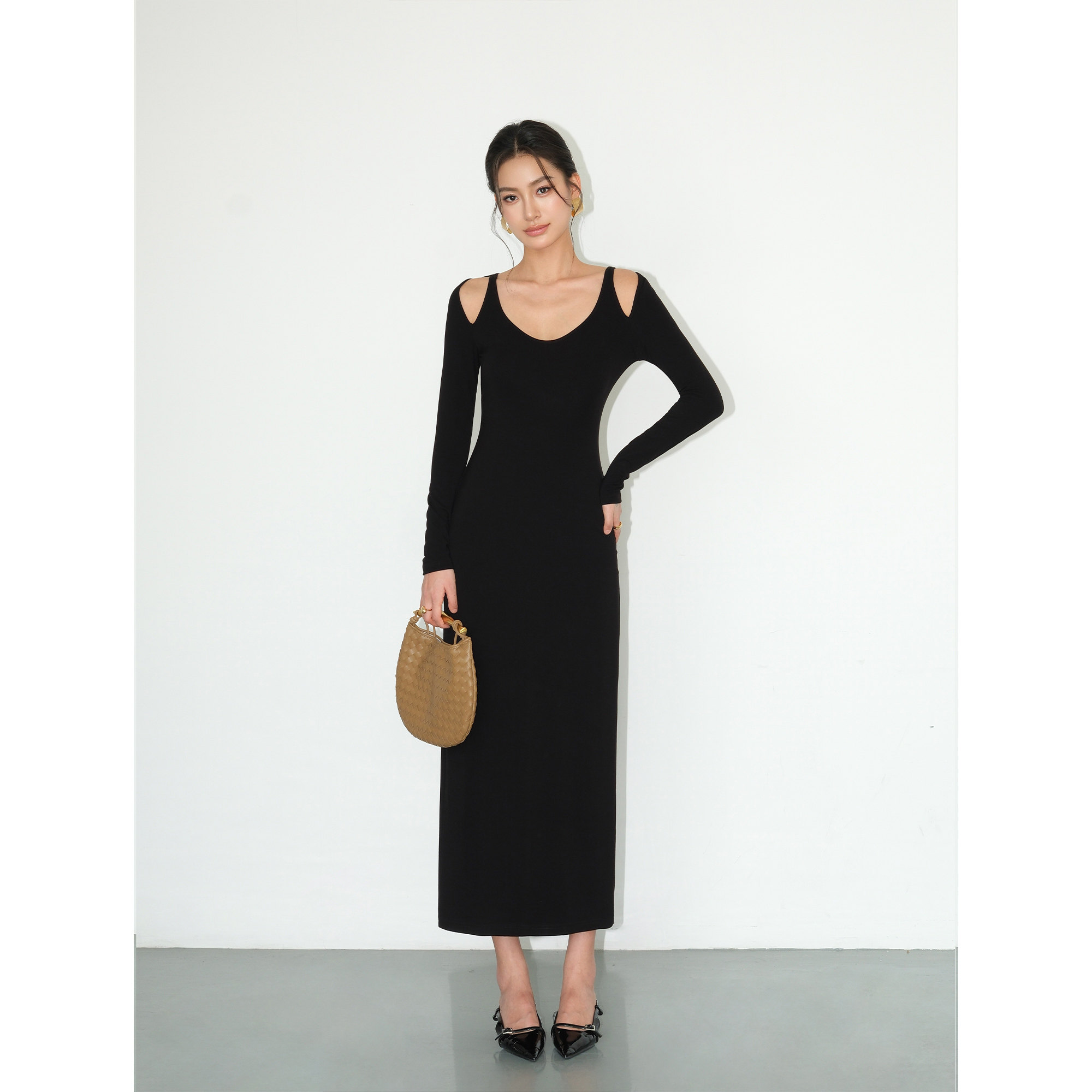 NEVA HU黑色长袖针织连衣裙女设计感小众镂空露肩气质修身裙子