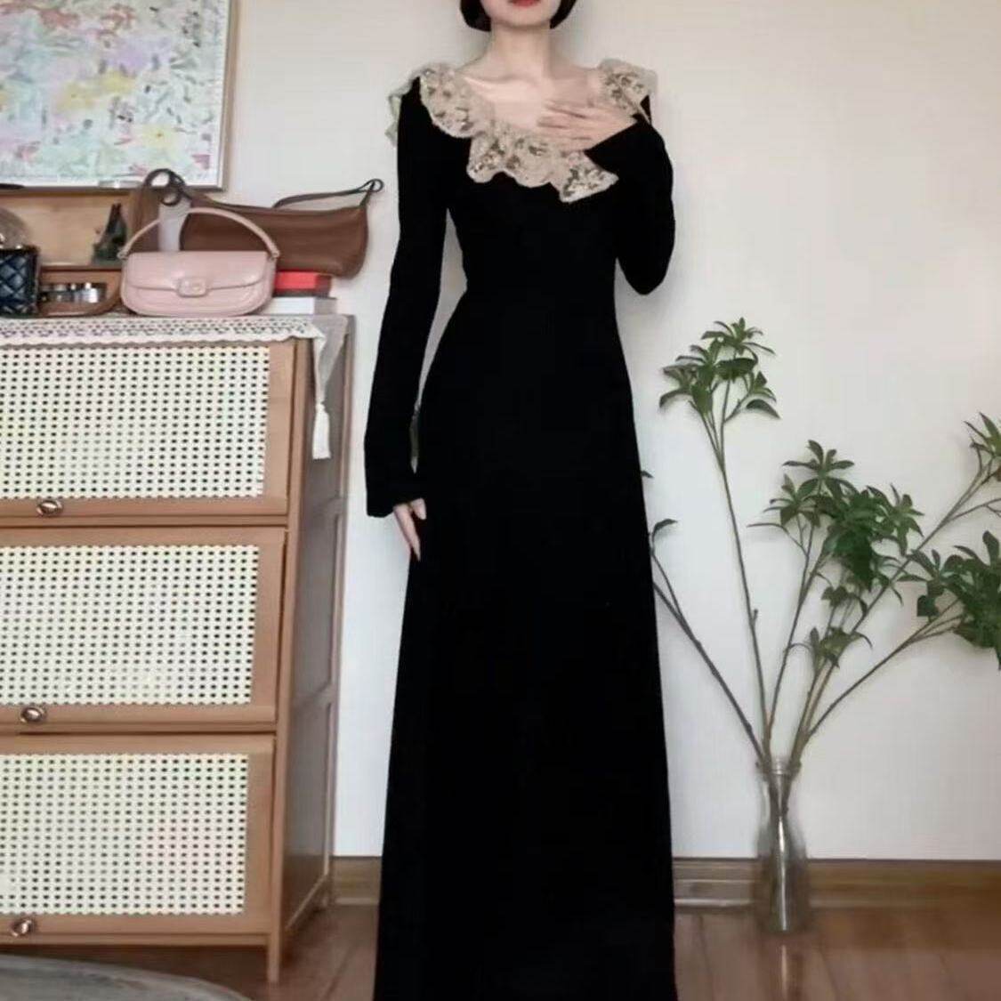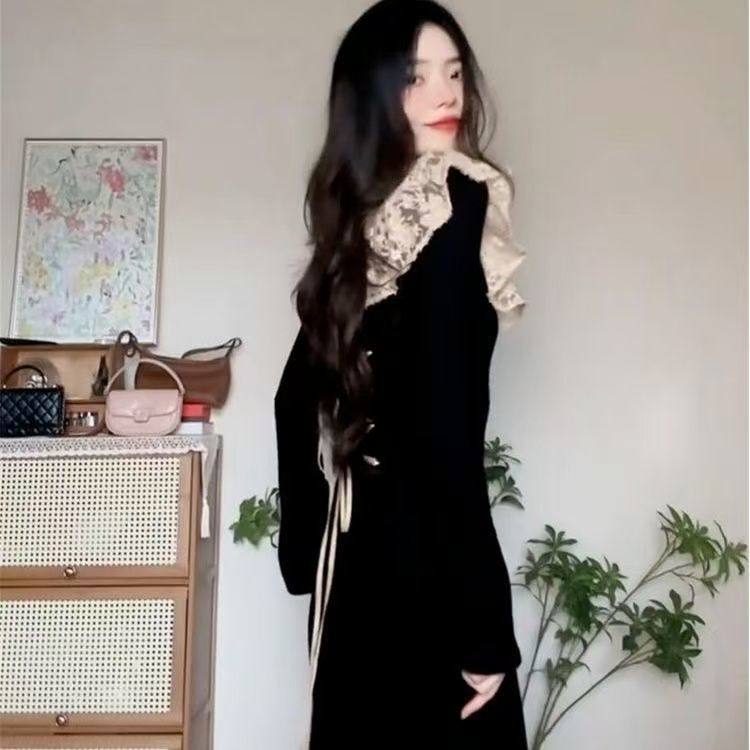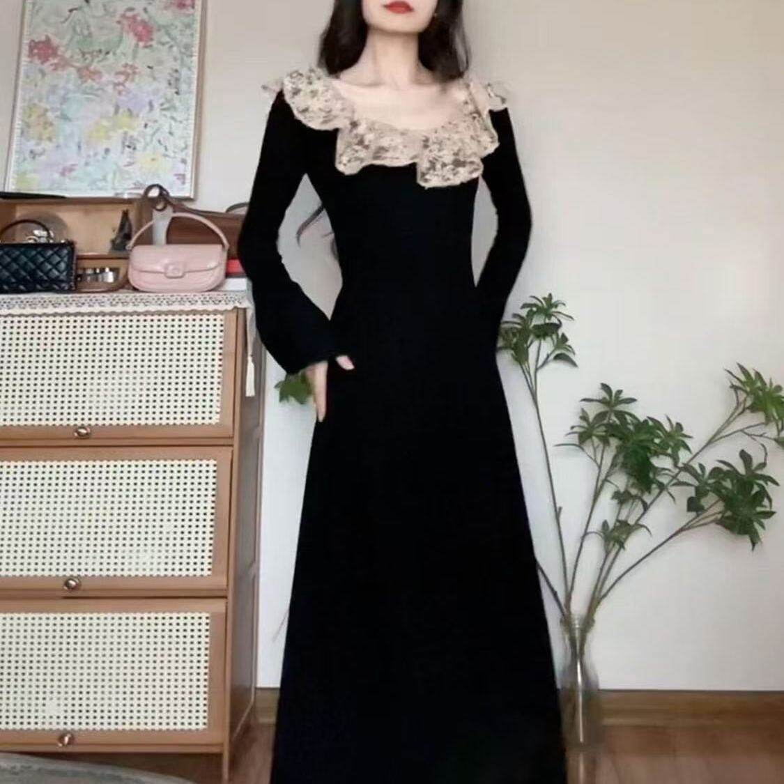 法式赫本风黑色针织长袖连衣裙子女早秋季2026新款巨好看气质长裙