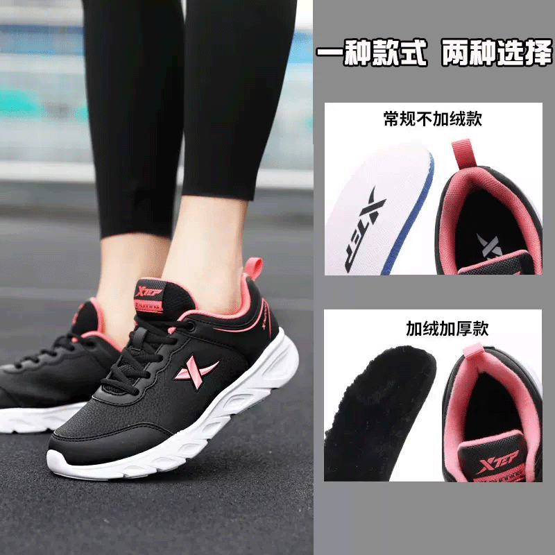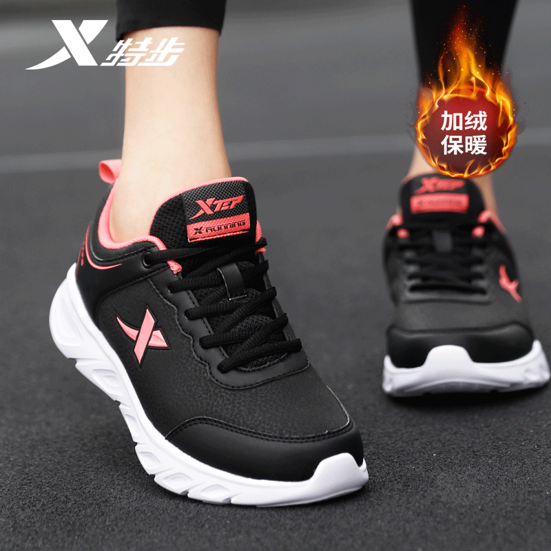 特步女鞋2026新款冬季休闲鞋子正品跑步鞋黑色加绒皮面防水运动鞋
