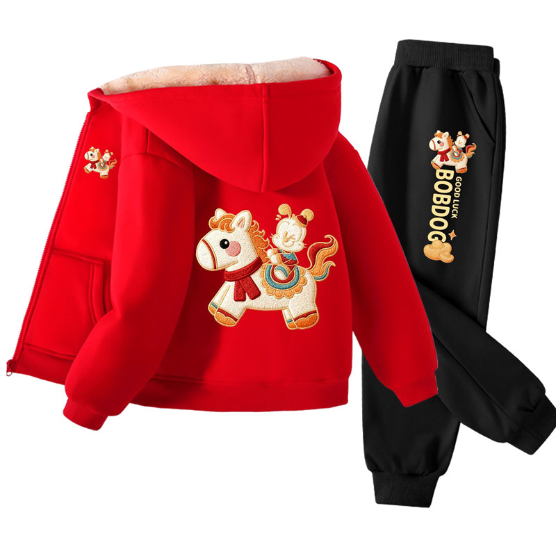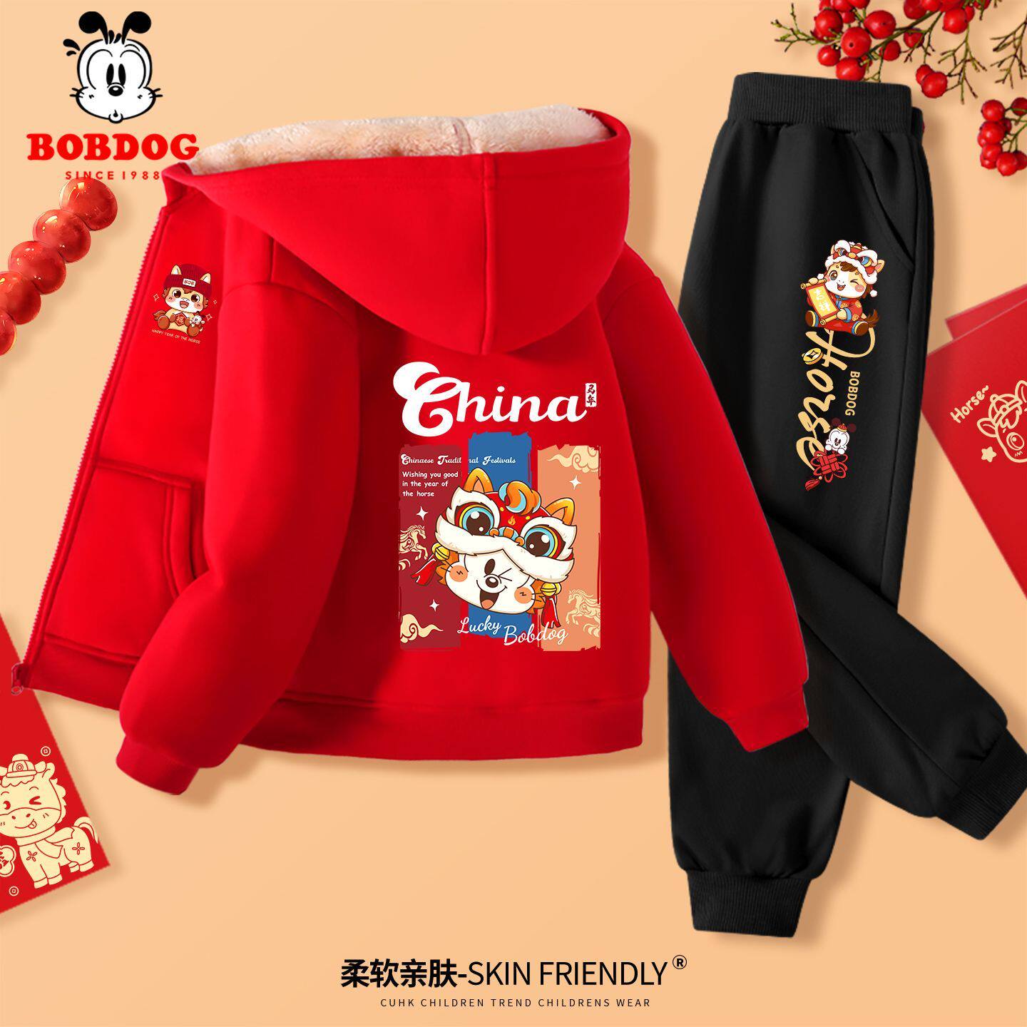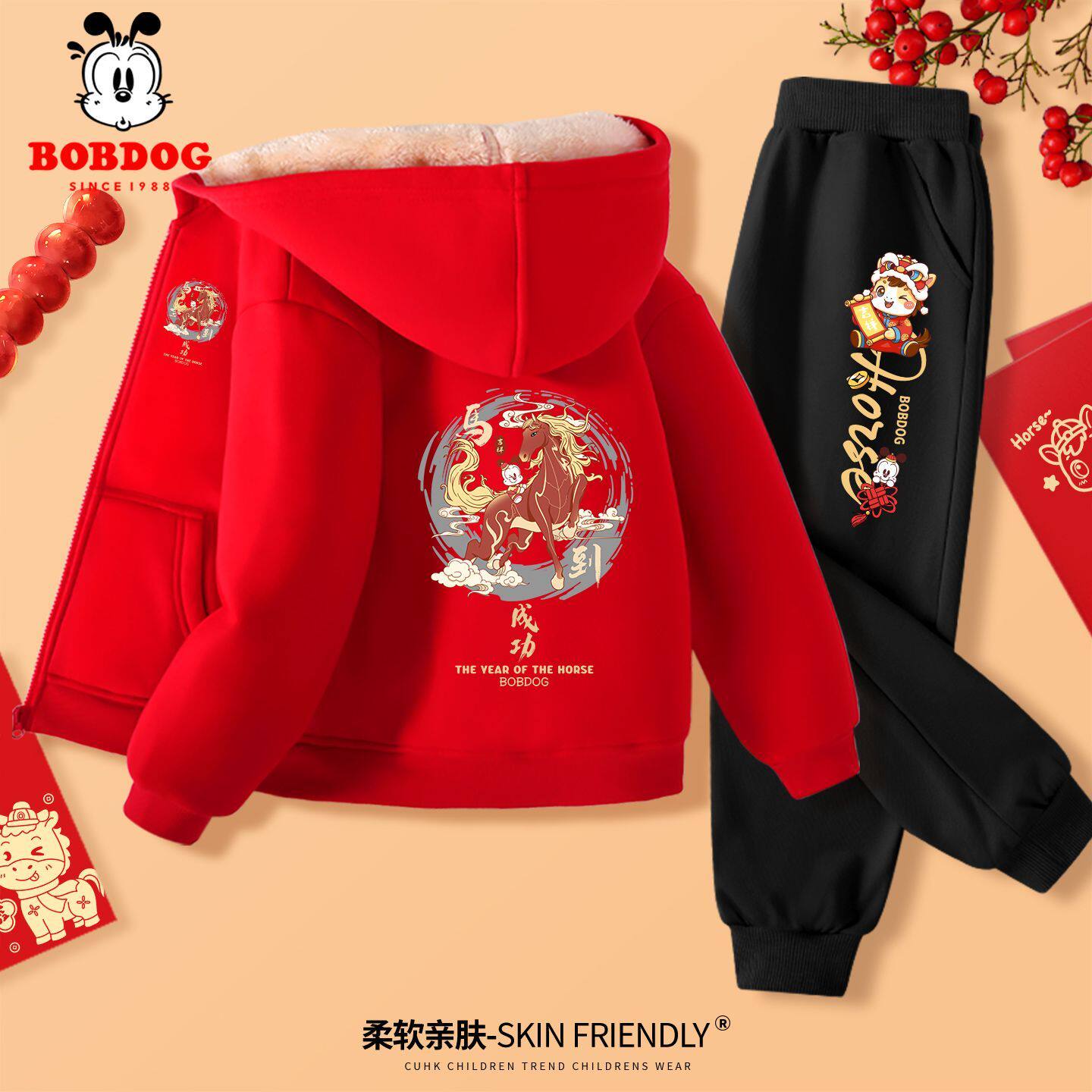 巴布豆儿童加绒套装2026马年男童新年红色外套冬季女童喜庆拜年服