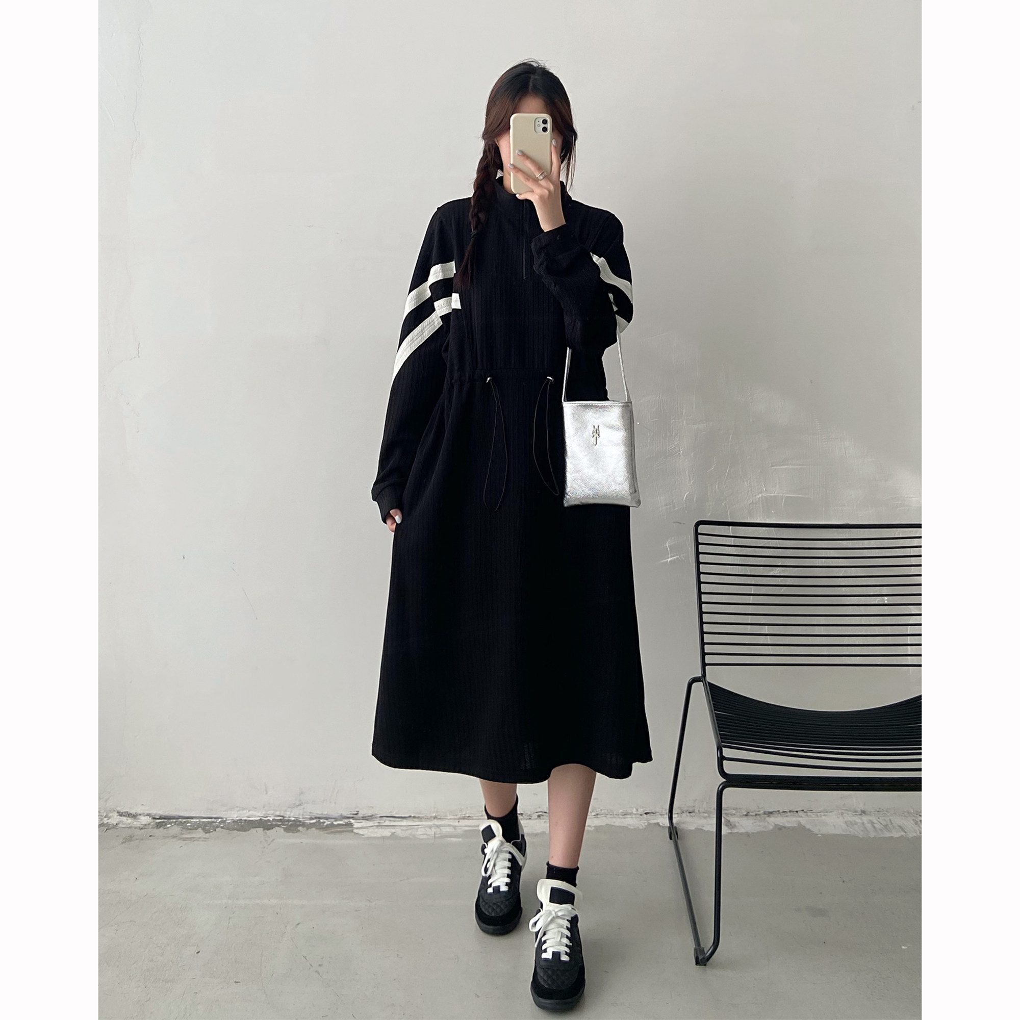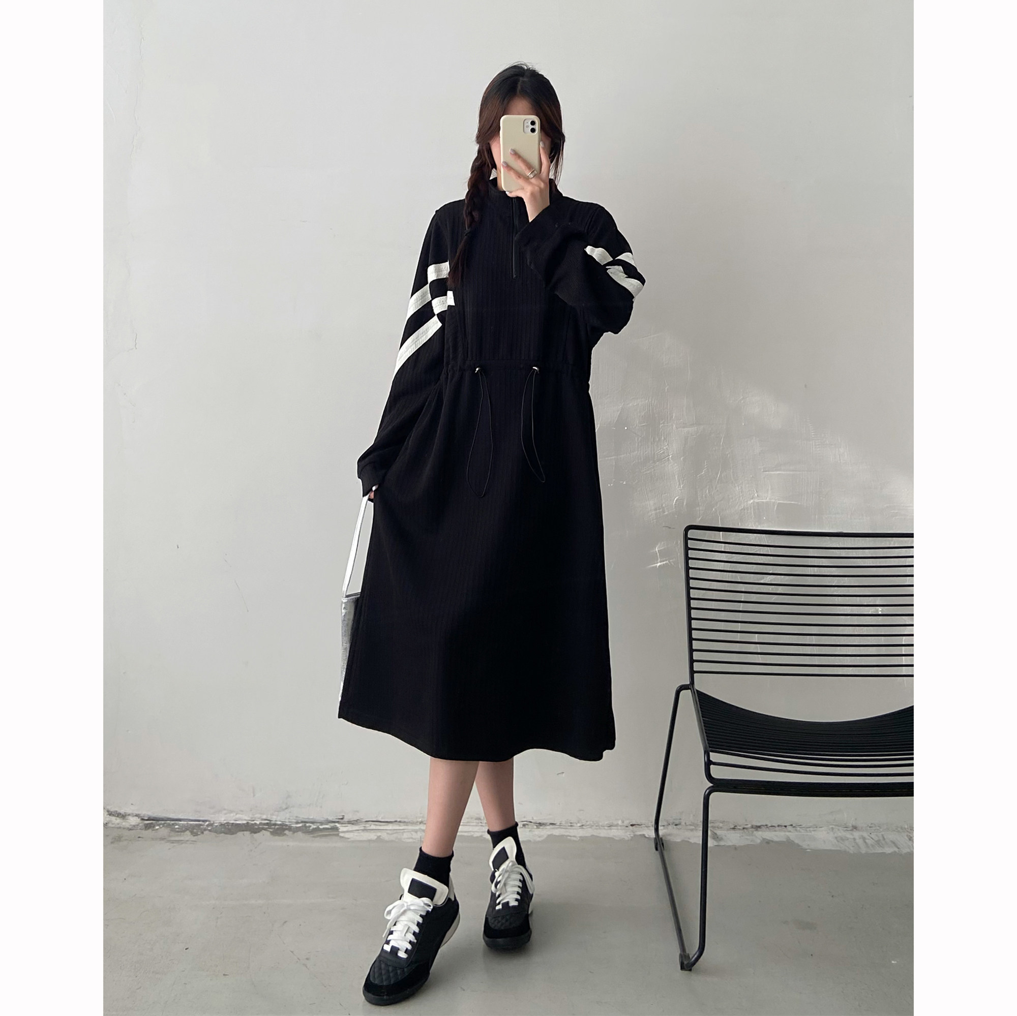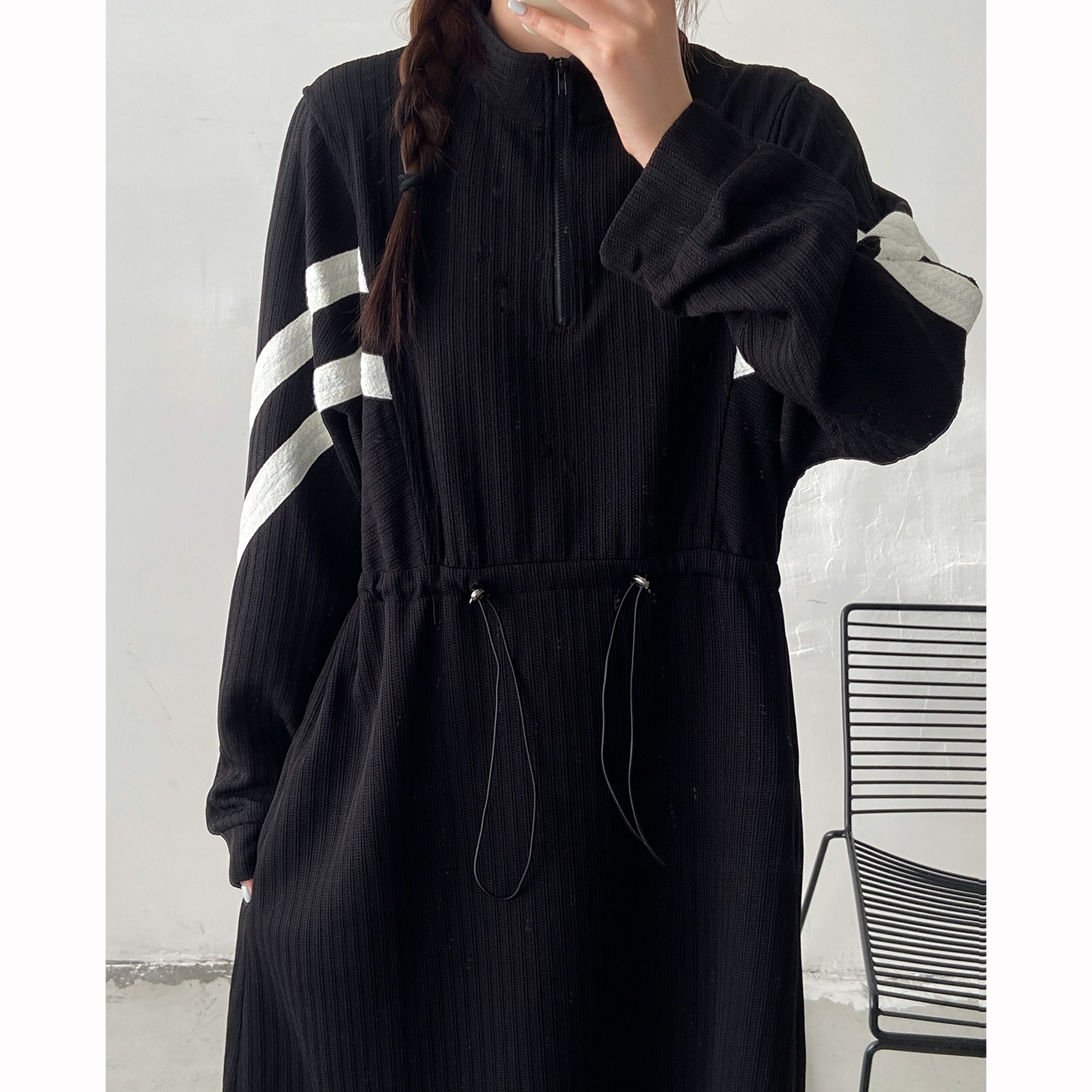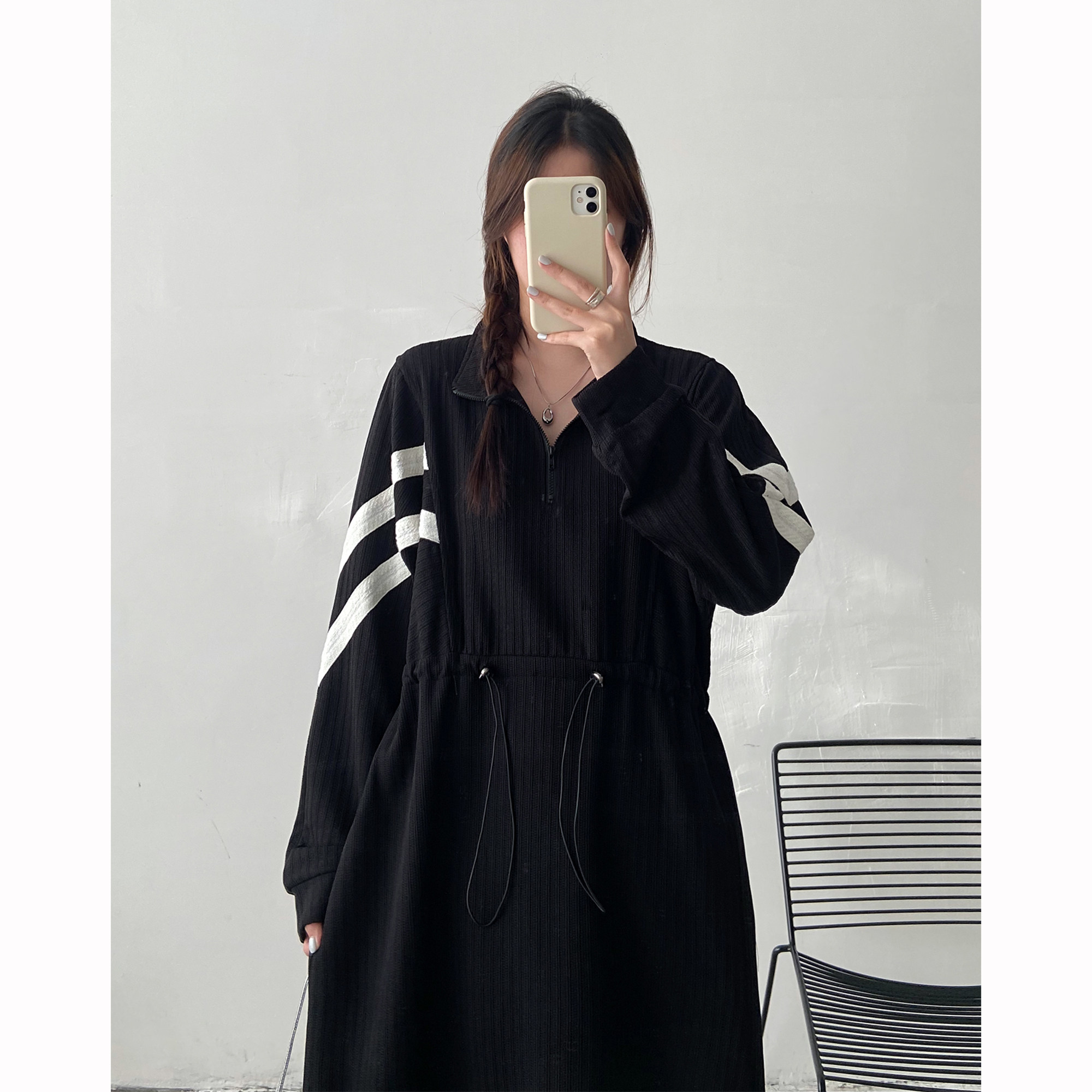 法式设计感抽绳长袖连衣裙女2025秋冬装新款胖mm宽松显瘦过膝裙子