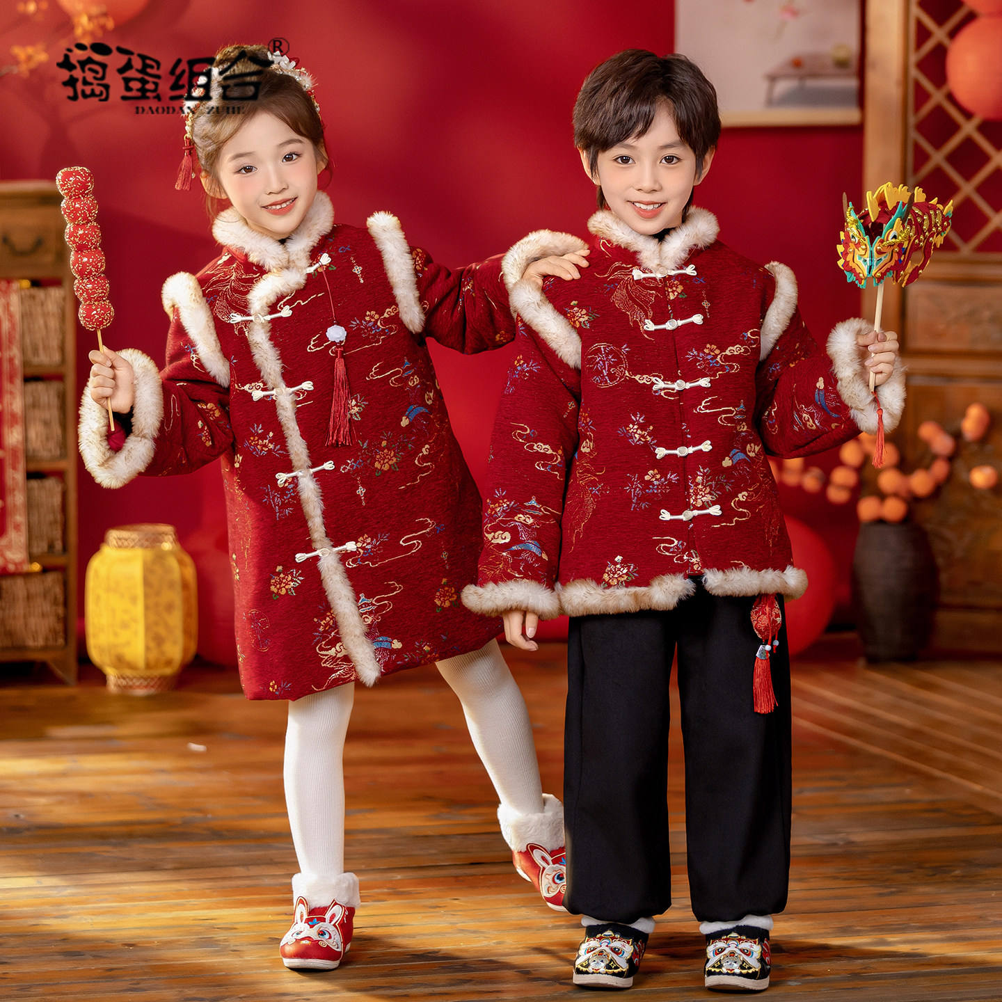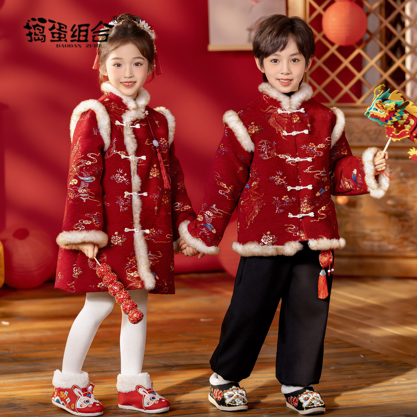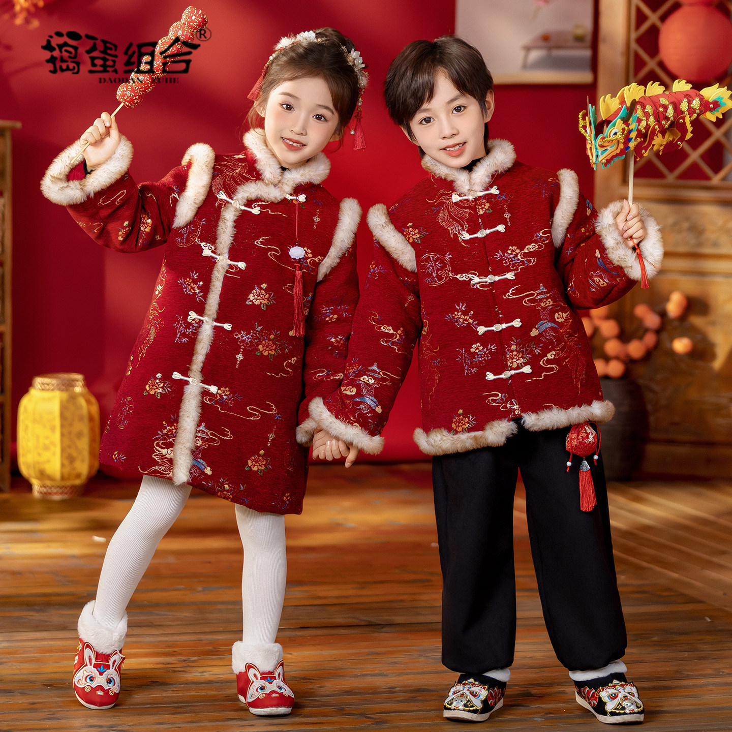 男童唐装冬装中式女童旗袍中国风加棉喜庆新年拜年服男宝宝过年服