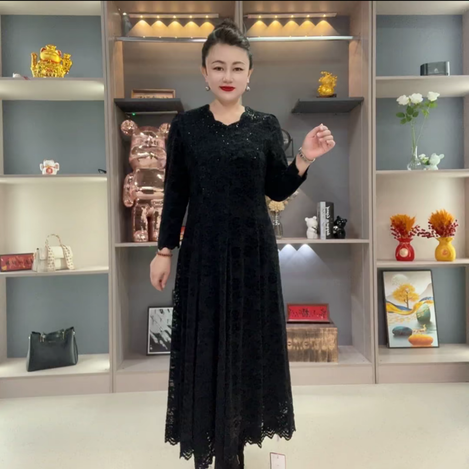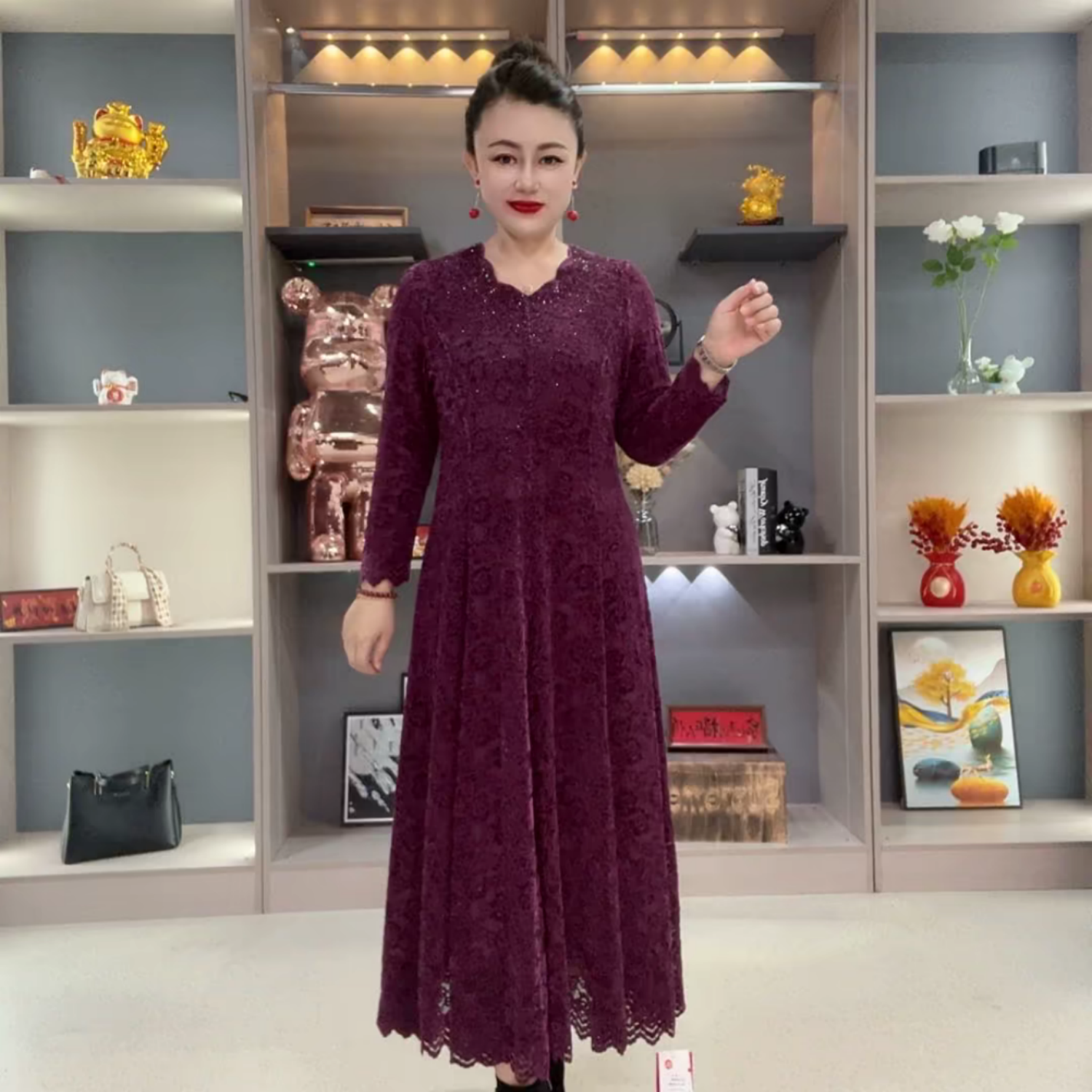高端冬季妈妈雪尼尔长袖时尚洋气大码加绒保暖高弹长款大摆连衣裙