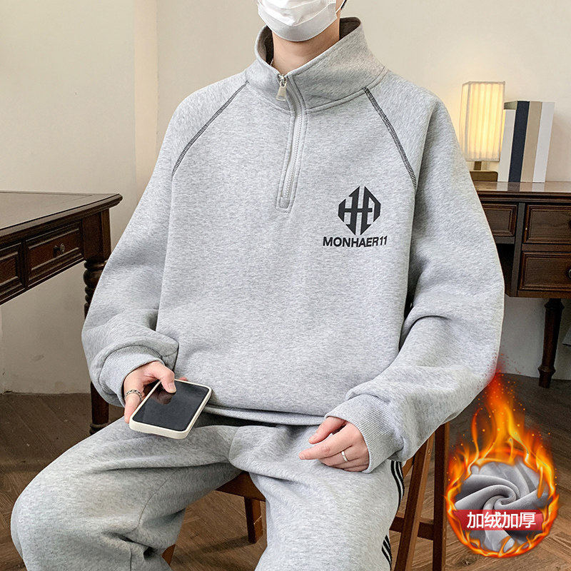 青少年秋冬加绒加厚卫衣套装男孩帅气潮流时髦初高中学生立领上衣