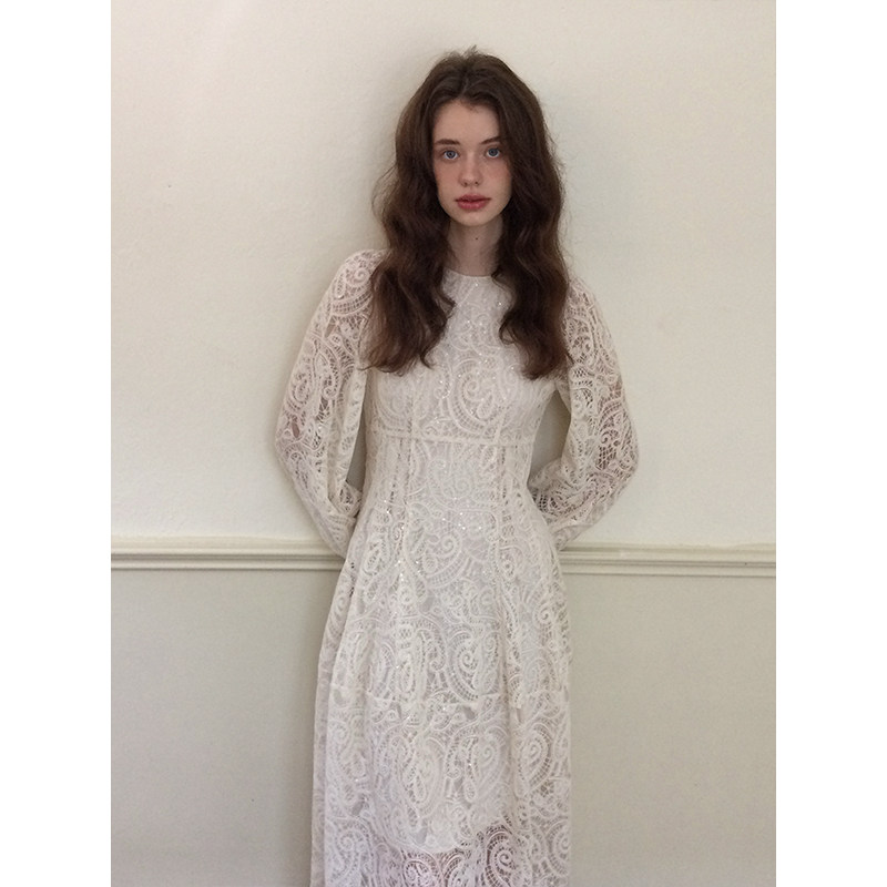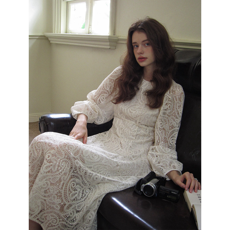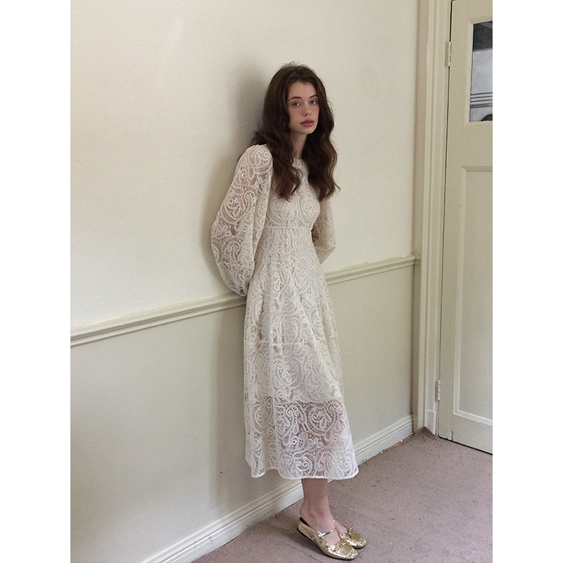 竹依依法式气质长袖秋冬薄纱连衣裙女收腰中长款蕾丝镂空A字裙