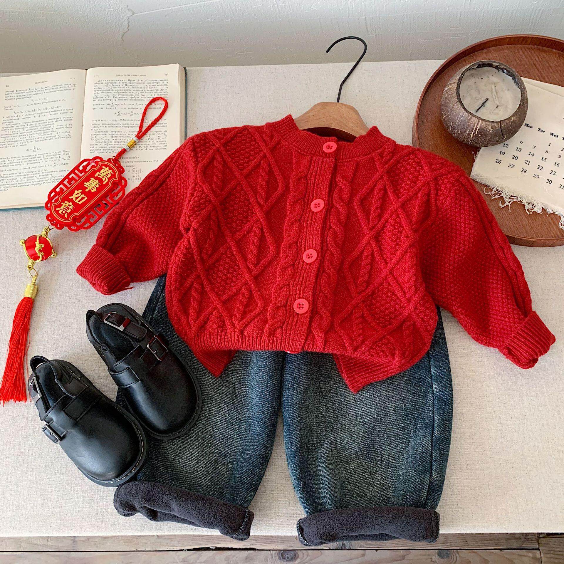 儿童红色毛衣冬款男童开衫小童提花新年衣服宝宝喜庆过年服女洋气