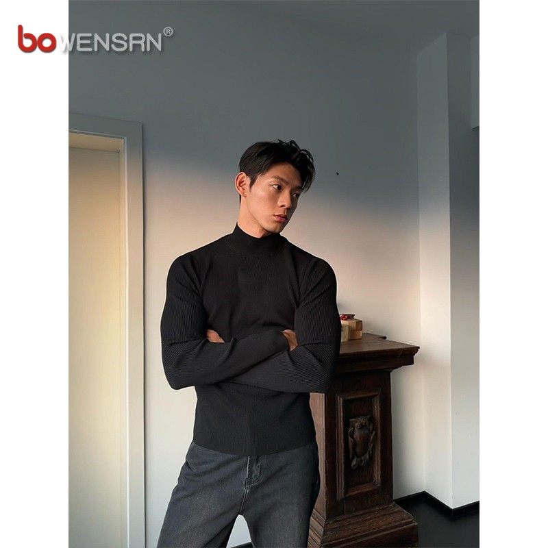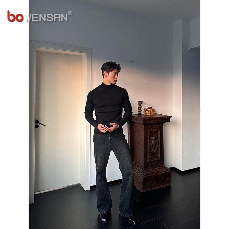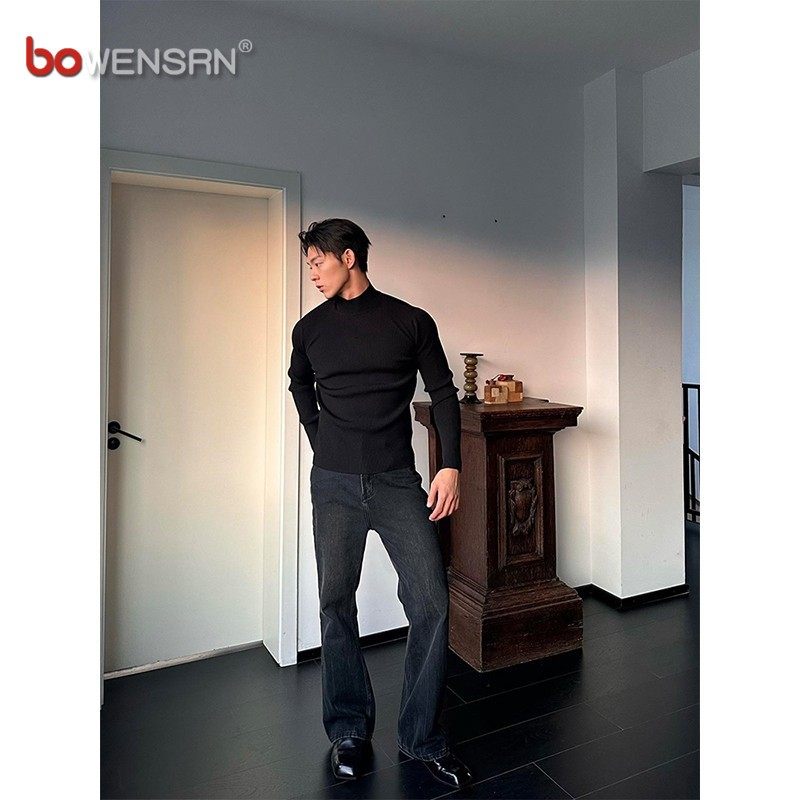 高端黑色半高领针织毛衣男士2025新款春秋冬季长袖t恤打底衫男款