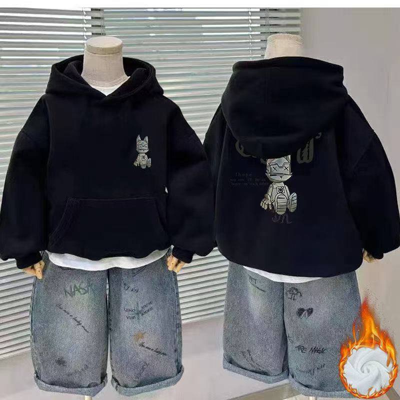 2025新款儿童男童连帽上衣中大童秋冬加厚卫衣潮加绒黑色卡通有帽