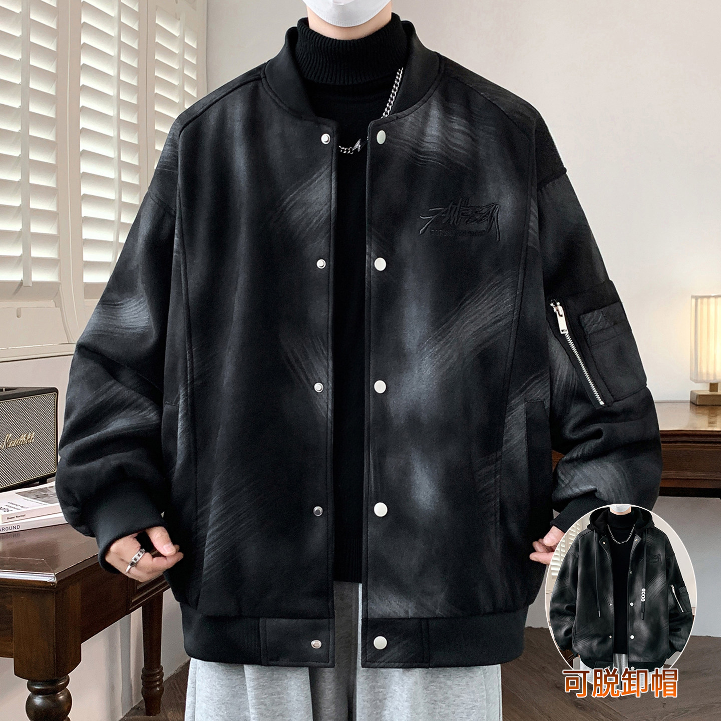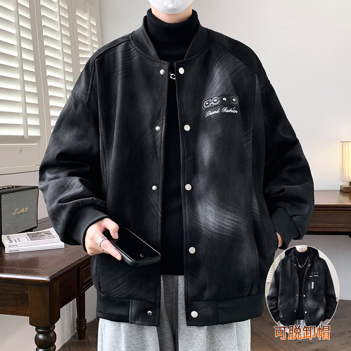 秋冬季新款连帽外套男生初高中学生加绒加厚夹克男装青少年上衣服