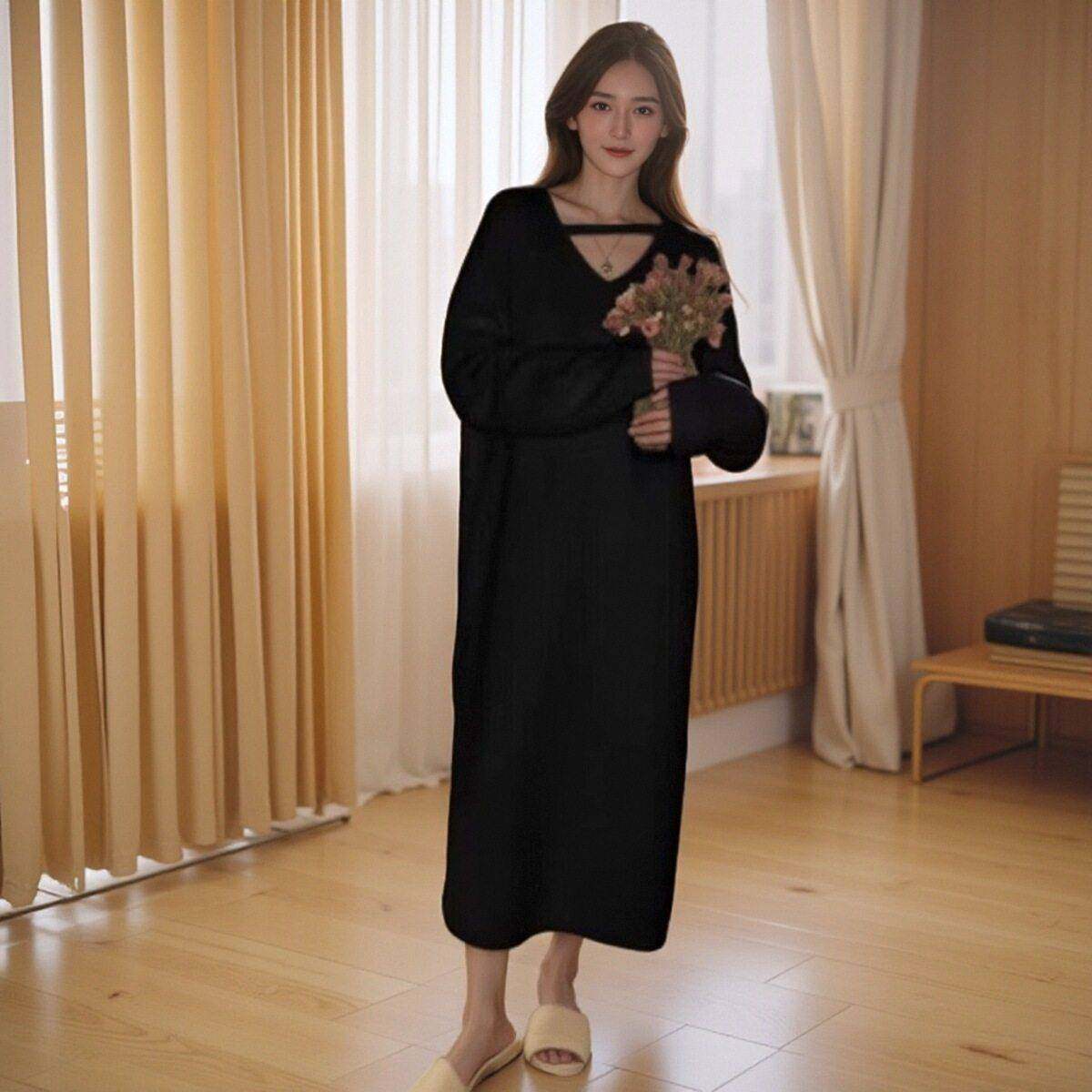 日系高级感白色v领针织连衣裙女秋冬软糯超好看打底裙内搭毛衣裙