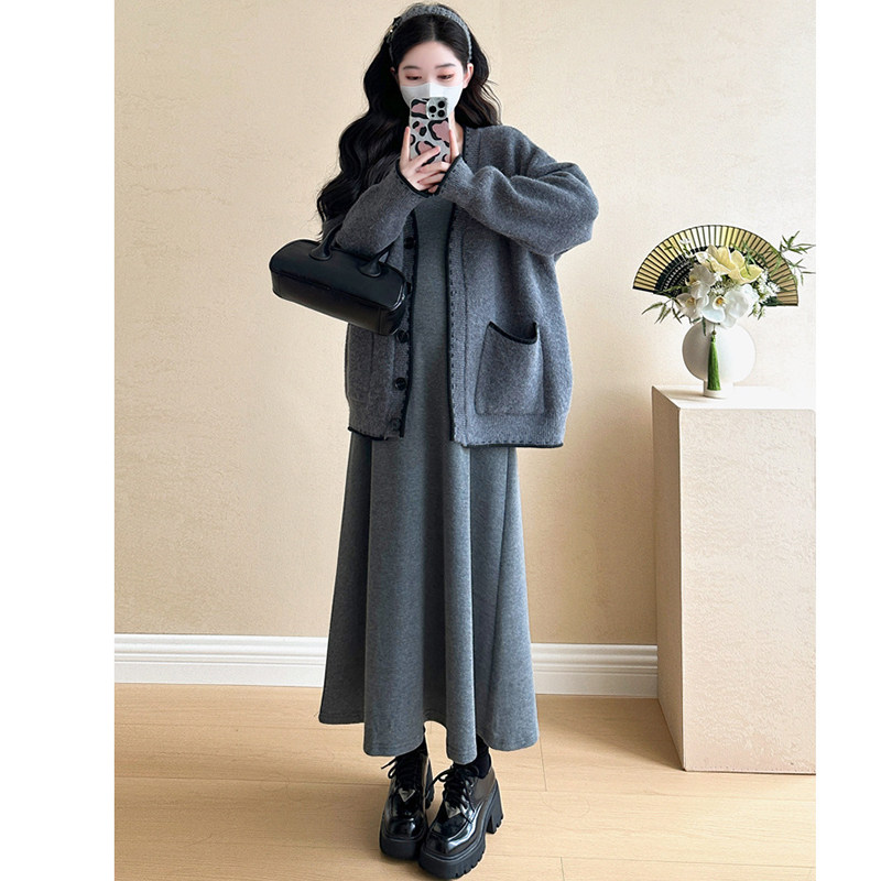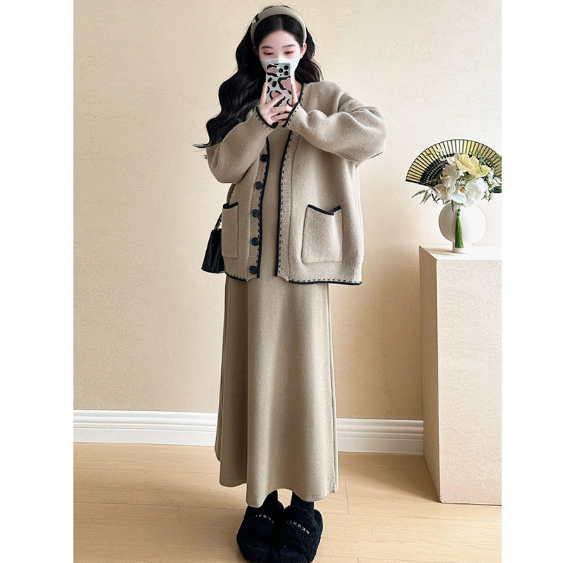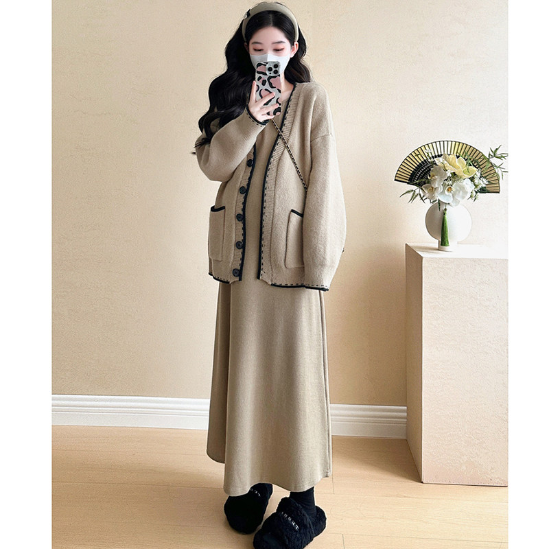 孕妇连衣裙套装秋冬韩版高级感卡色宽松针织毛衣外套打底裙两件套