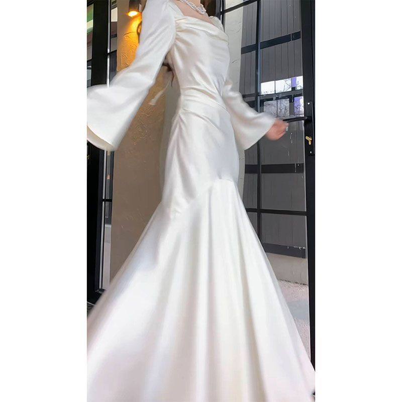 法式长袖鱼尾优雅连衣裙主持人礼服显高显瘦时尚白色缎面宴会服装