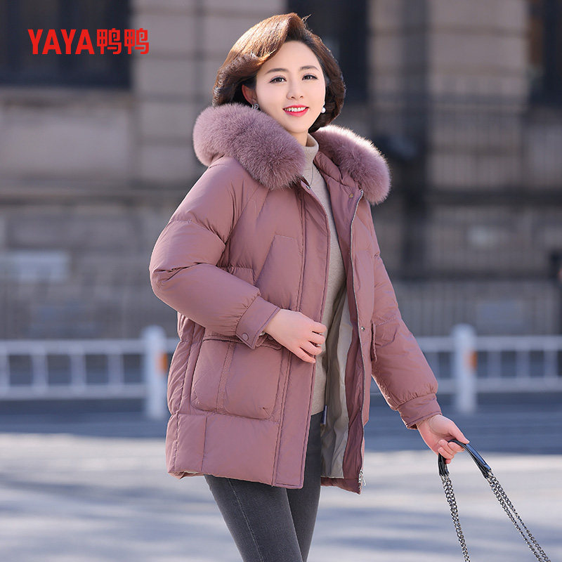 鸭鸭妈妈中长款羽绒服女冬季新款毛领连帽中年女装外套中老年冬装