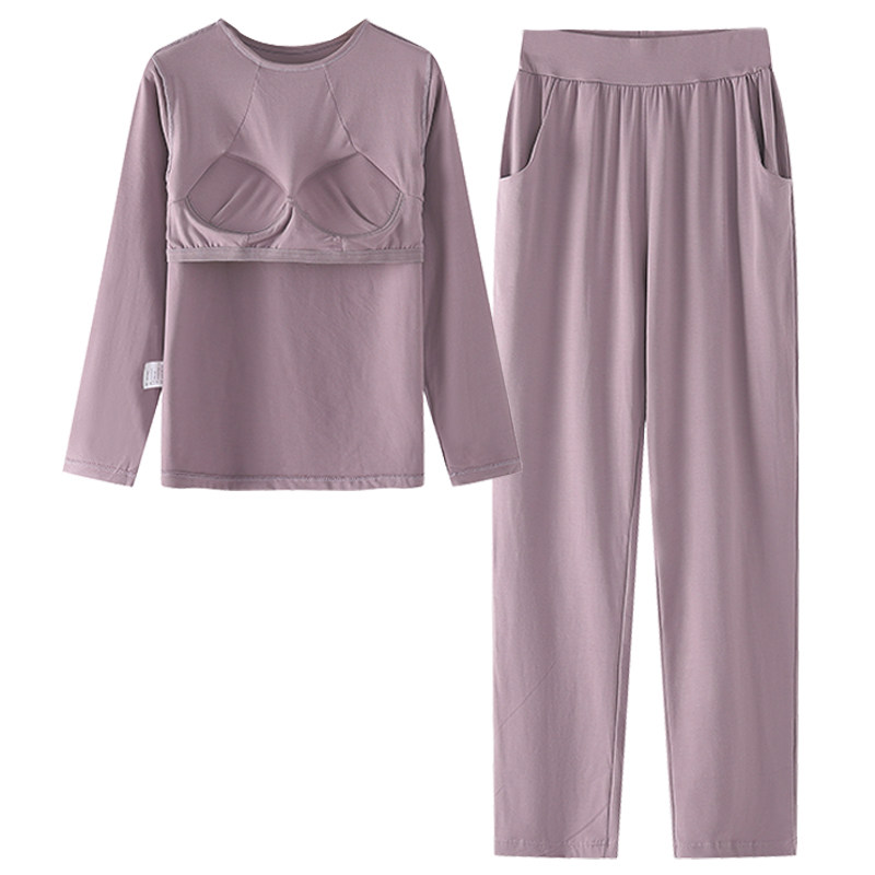 两件套秋冬女带胸垫免文胸家居服长袖长裤睡衣套装休闲瑜伽可外穿