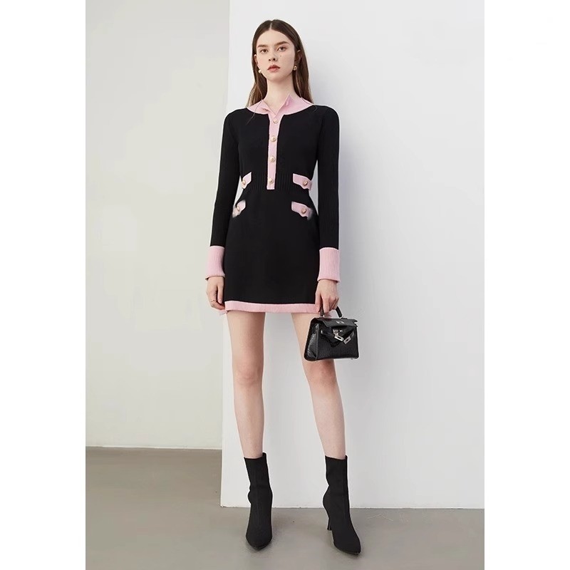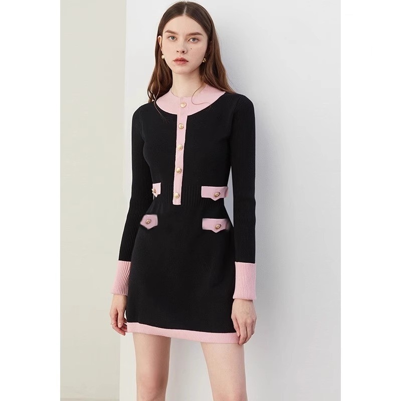 2024秋季新品优雅气质拼色圆领收腰连衣裙长袖针织连衣裙女