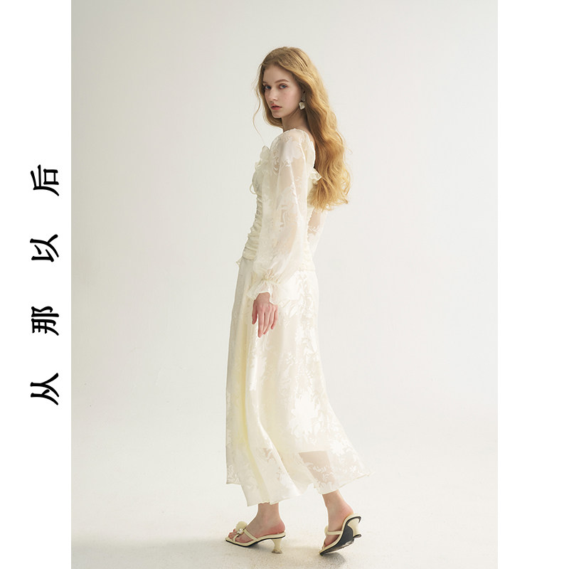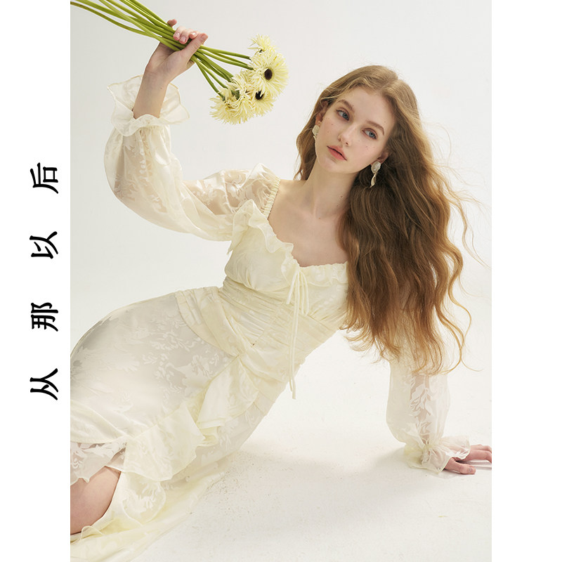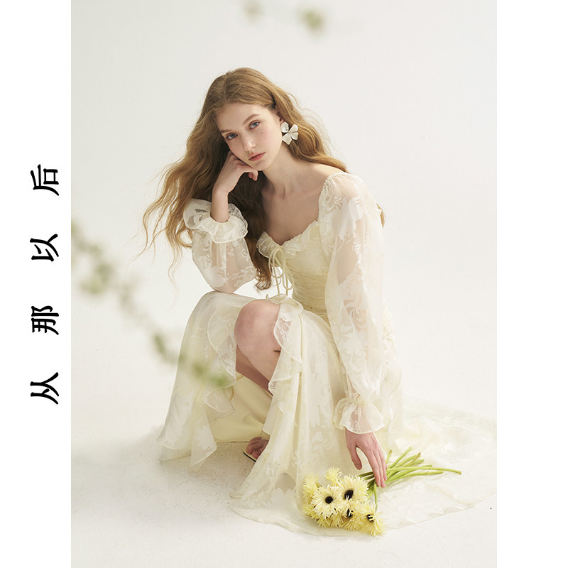从那以后白茶布蕾白色长裙穿搭高级感礼服裙度假长袖连衣裙女夏季
