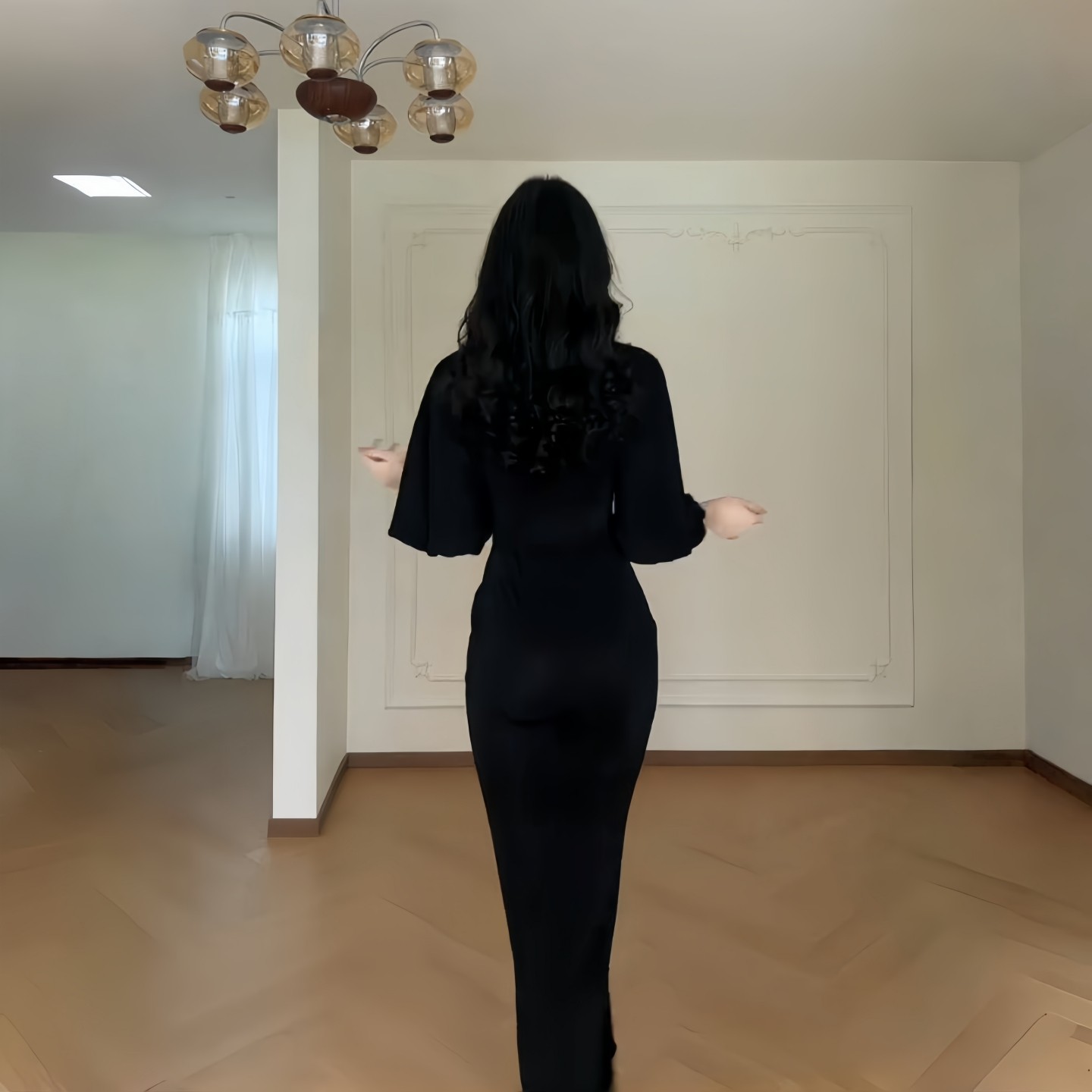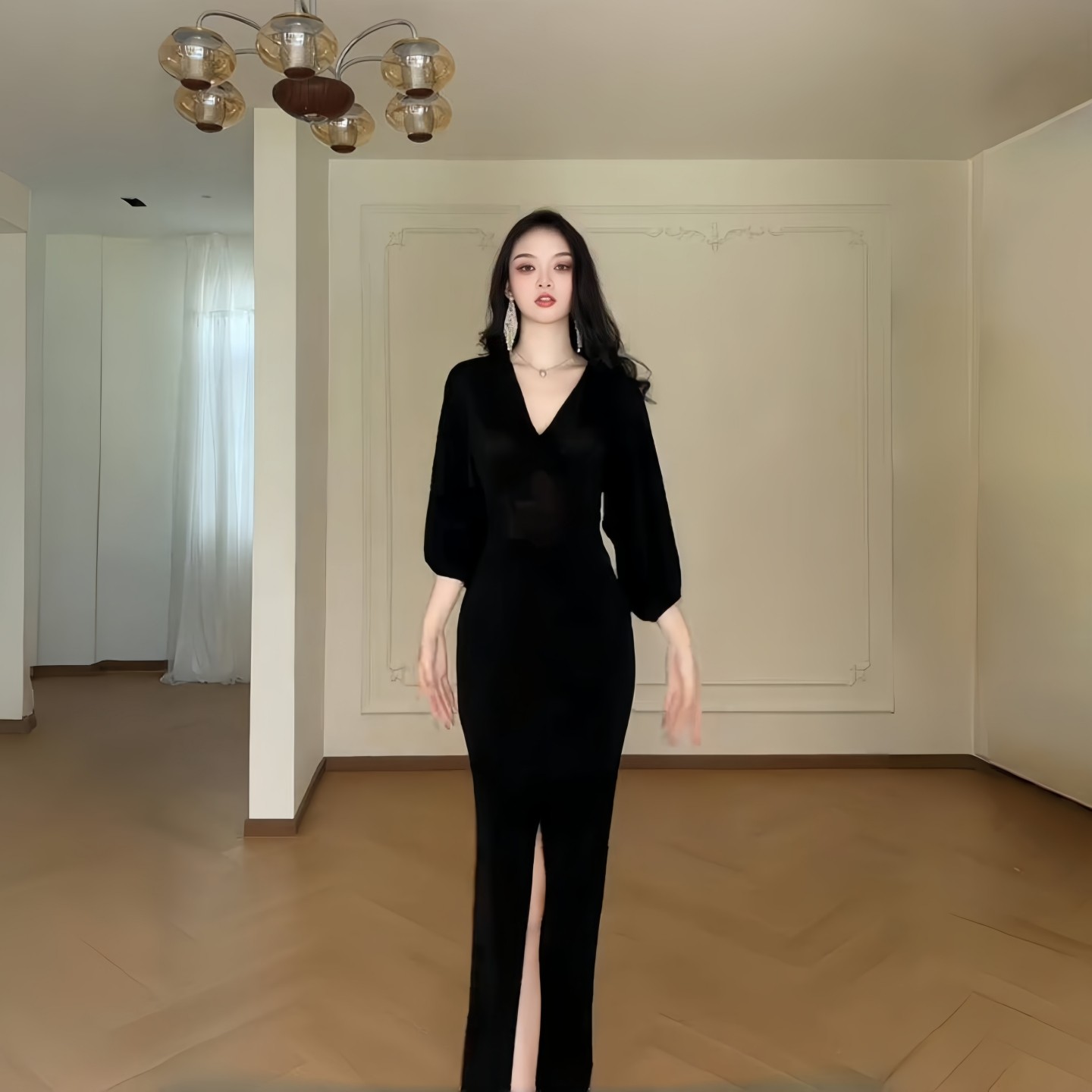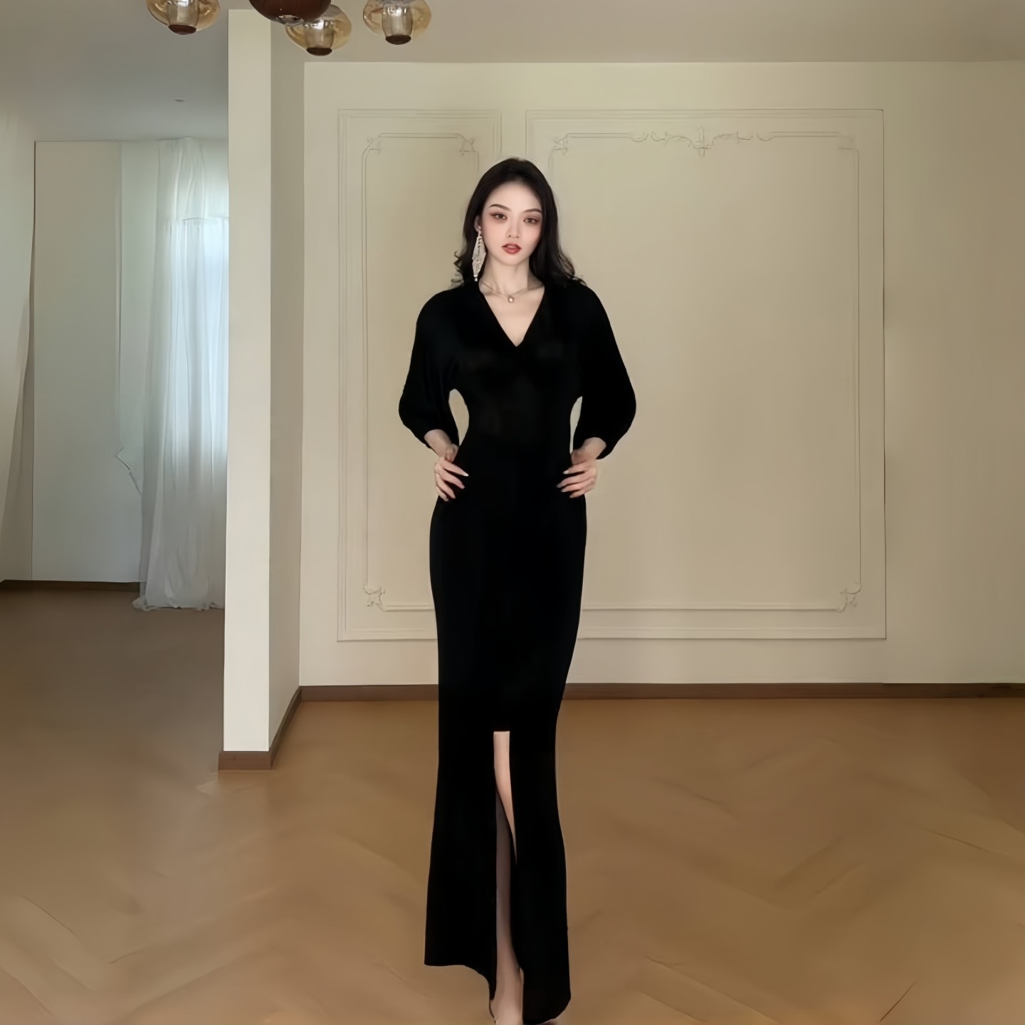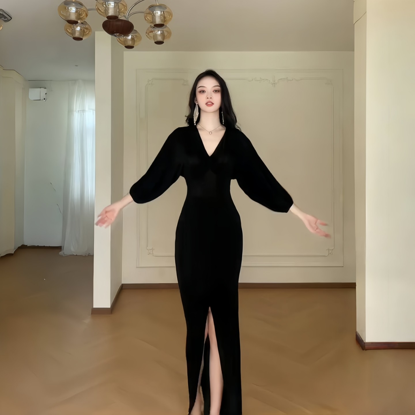 GirlsAt18黑色V领中袖连衣裙女夏季法式高级气质性感收腰开叉长裙