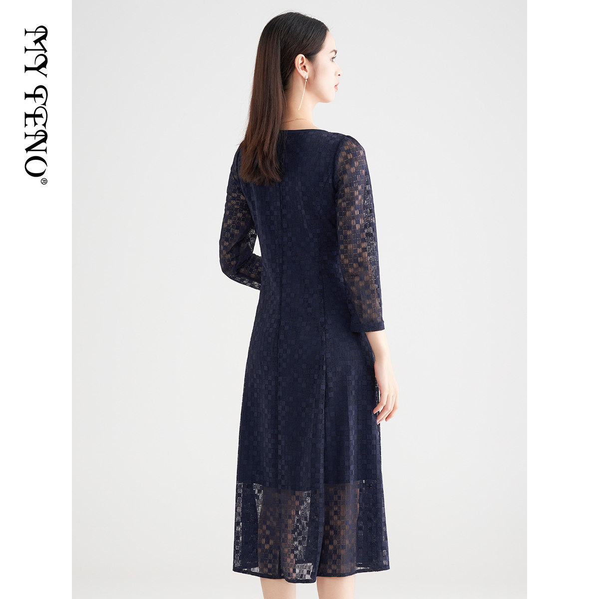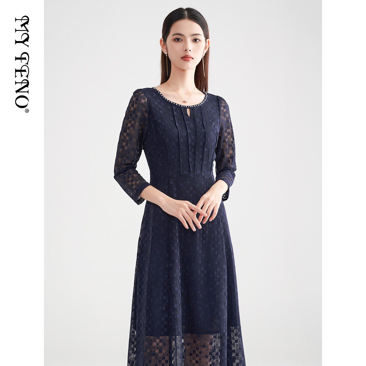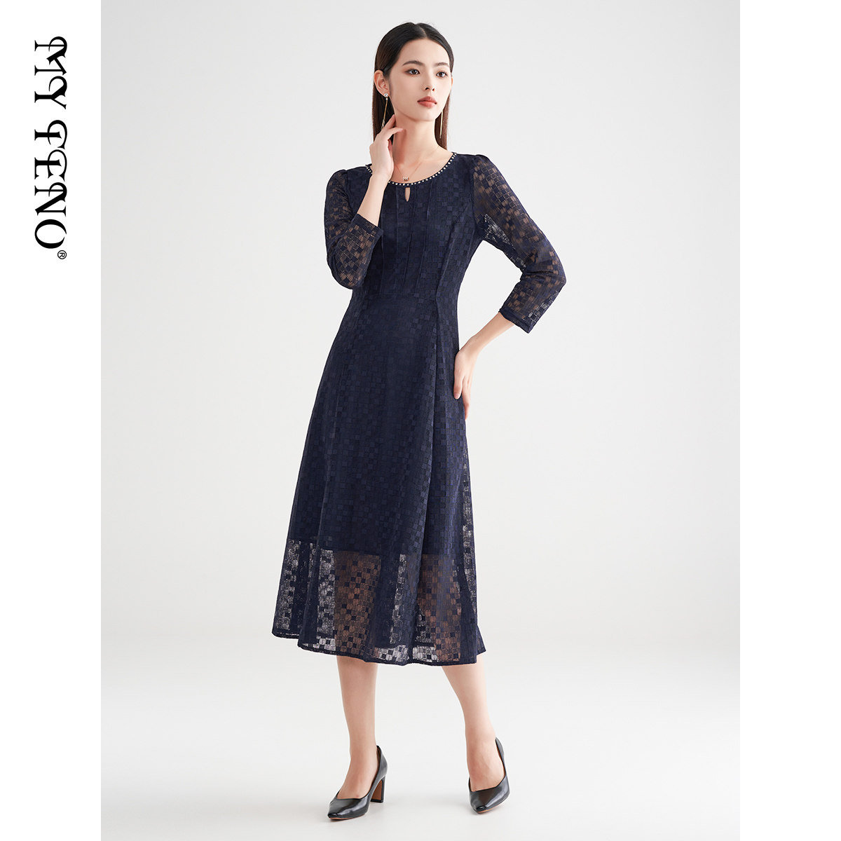 311线报网描述:蓝色缝钻圆领格纹 收坠感腰 长裙长袖礼裙