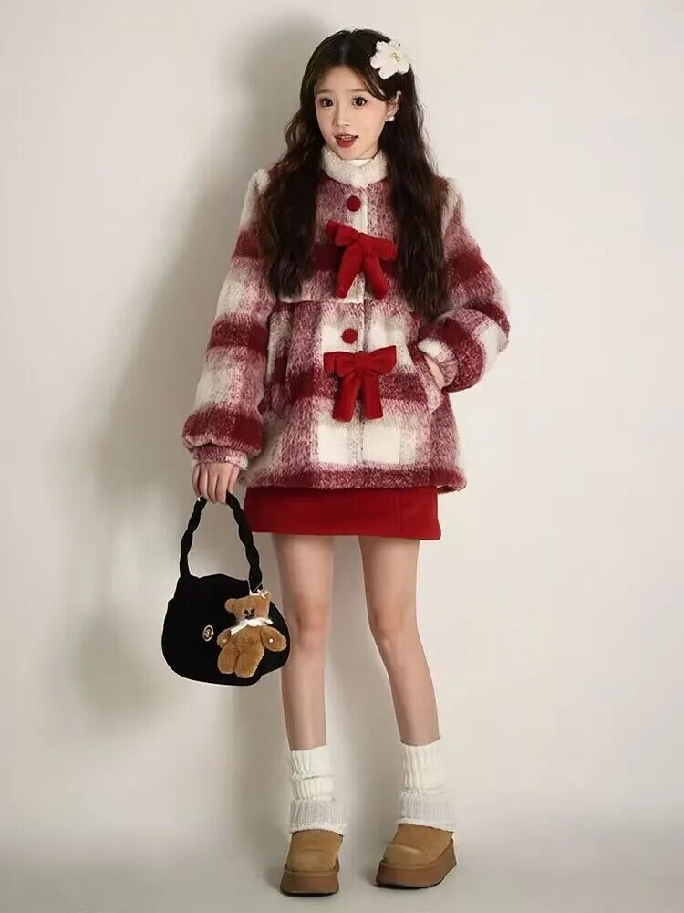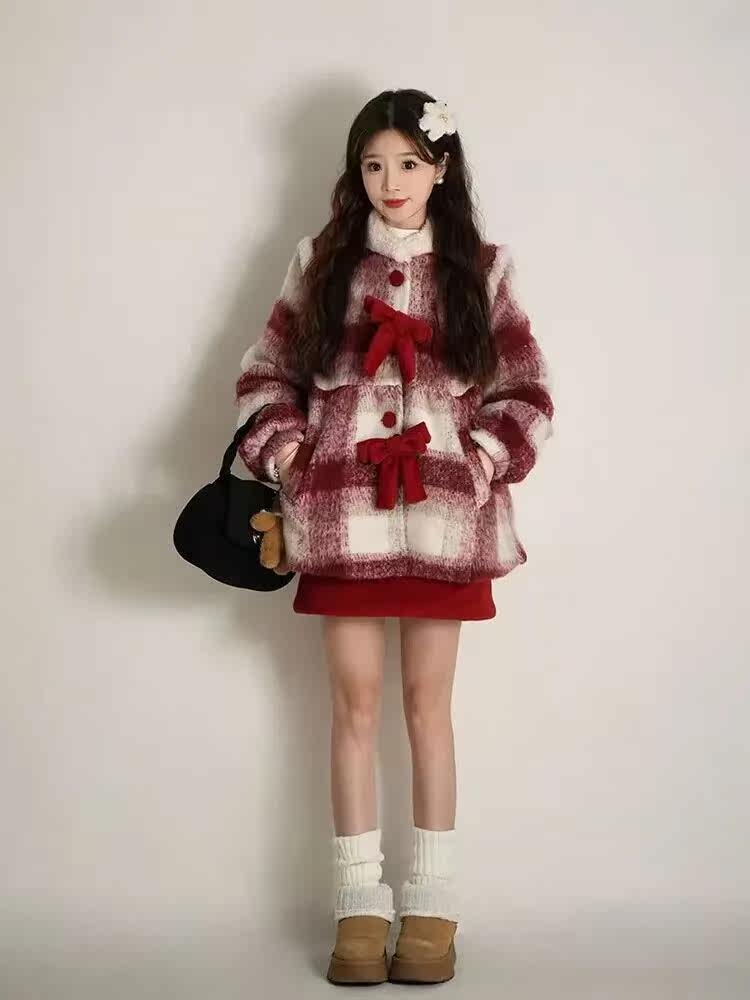 女秋冬新款高级感加厚宽松中长款大衣现货小香风红色格子毛呢外套