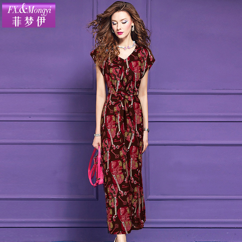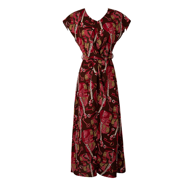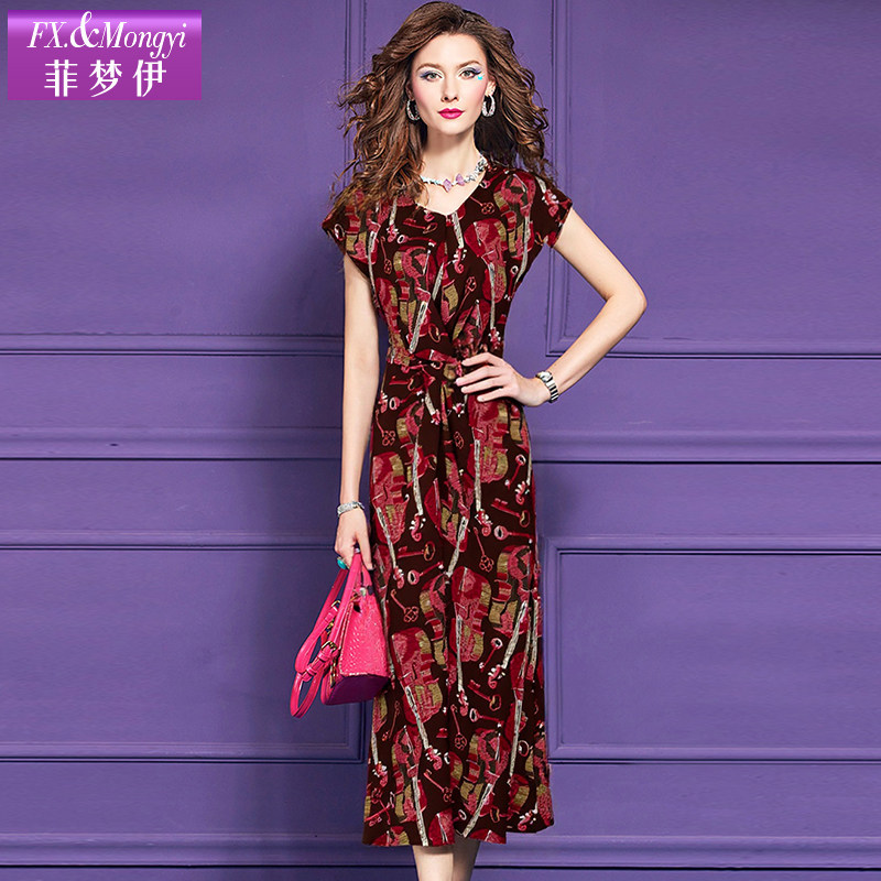 菲梦伊印花红色连衣裙女短袖夏季复古轻薄系带收腰大码中长款裙子