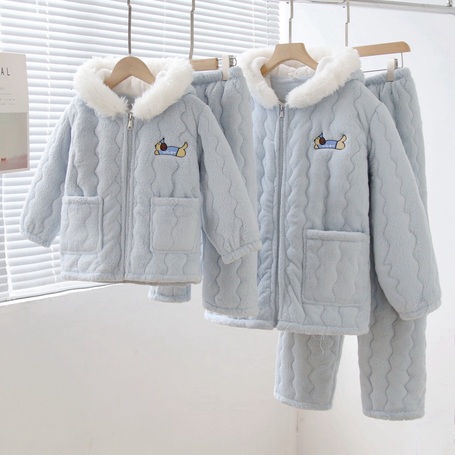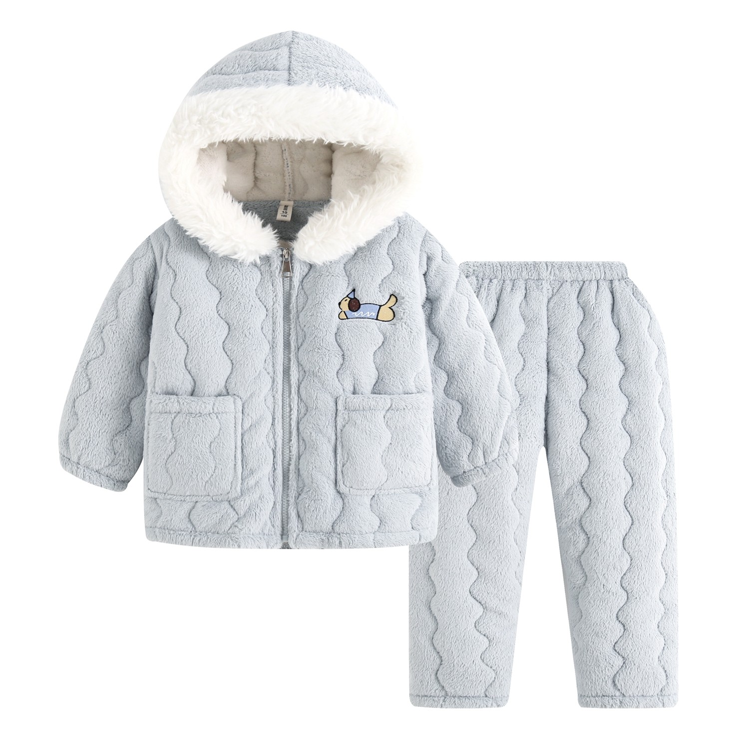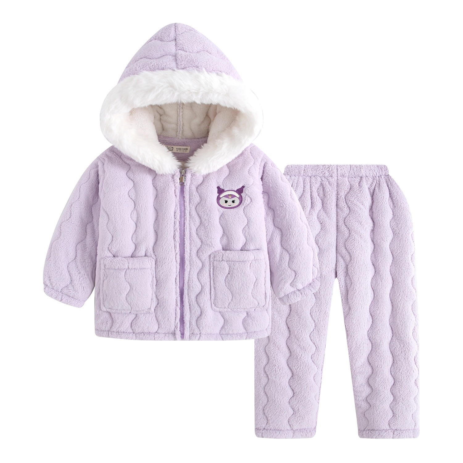 冬季毛绒绒带帽拉链女童加厚夹棉家居服套装小孩女孩宝宝外出休闲