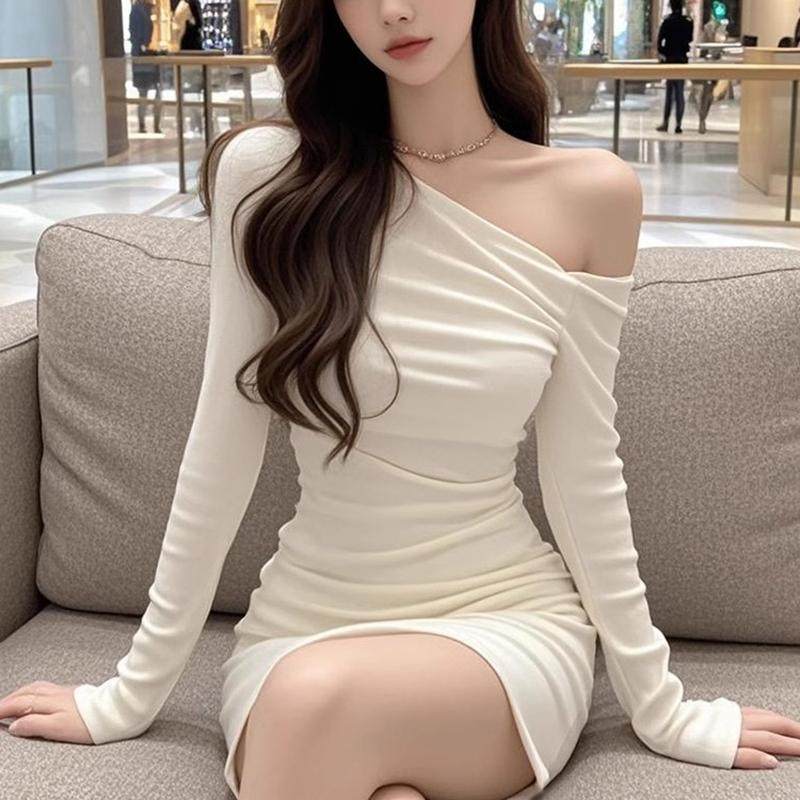 2025辣妹风白色斜肩长袖连衣裙女秋季新款小个子收腰显瘦包臀短裙