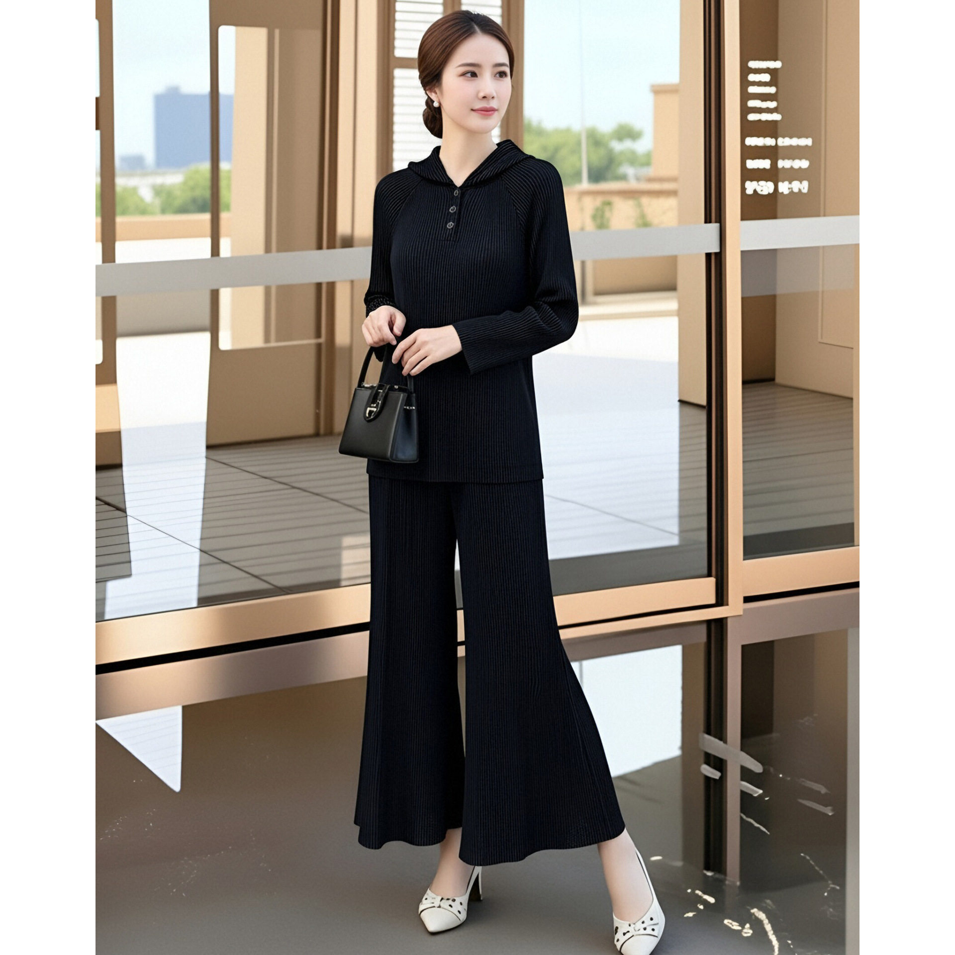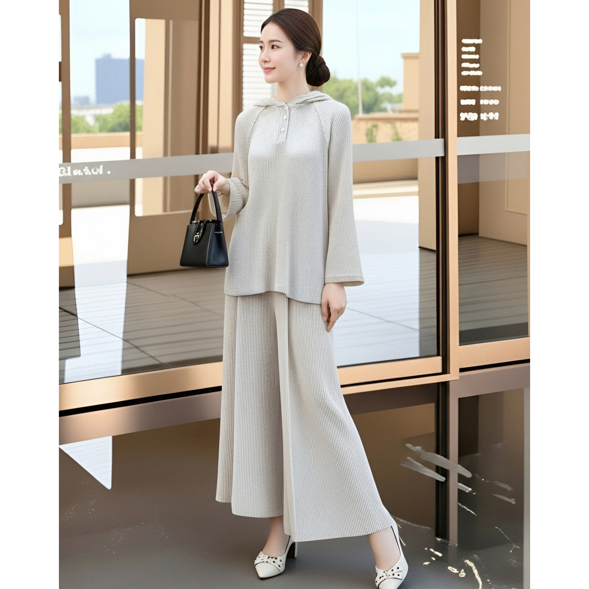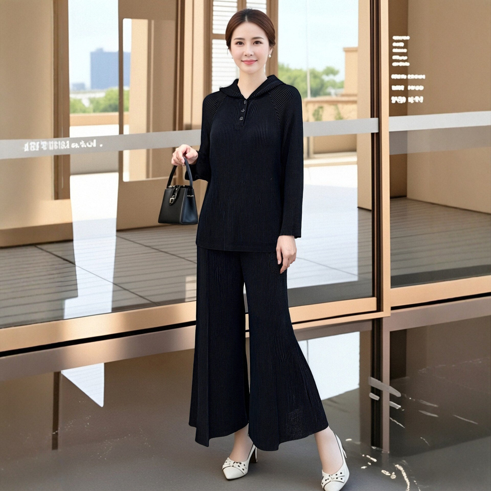 2026早春新款妈妈装褶皱套装中老年大码显瘦连帽上衣阔腿裤两件套