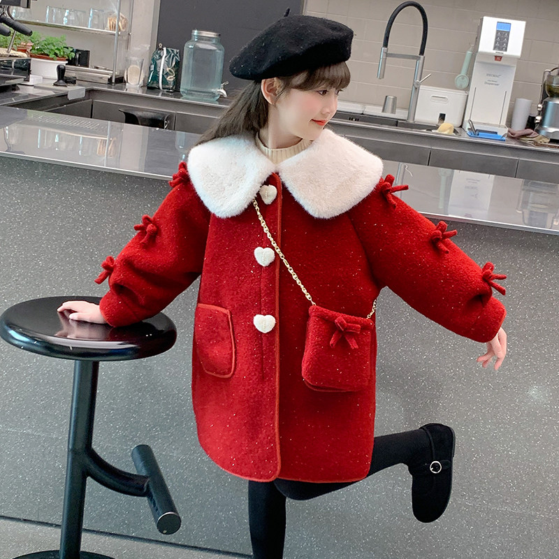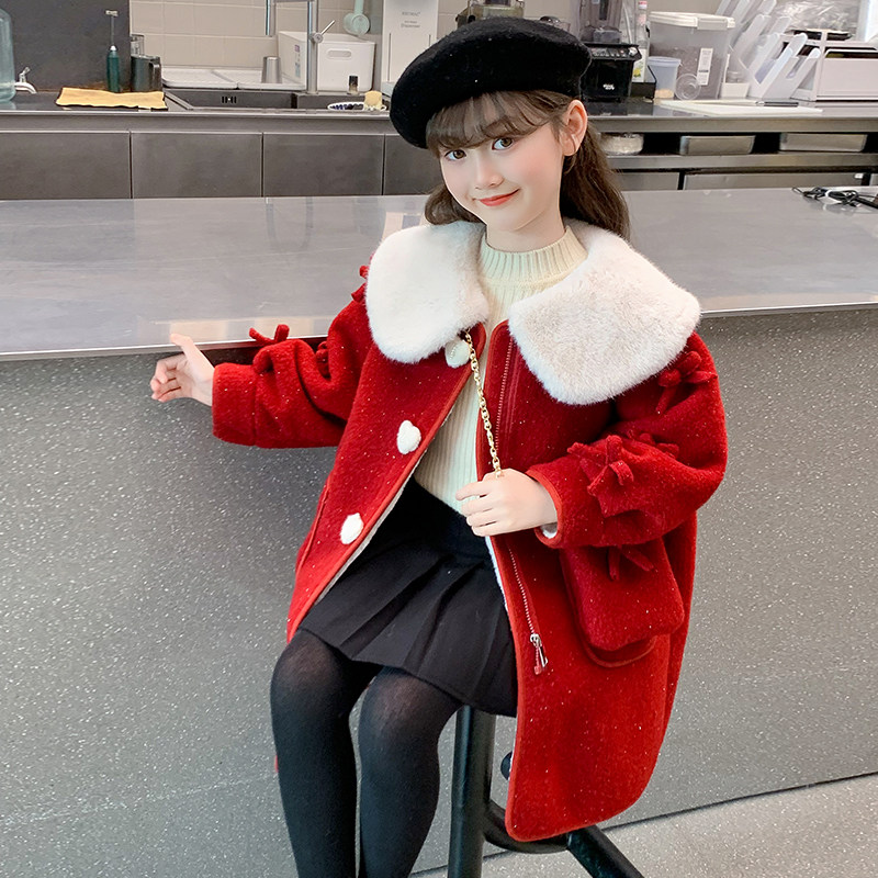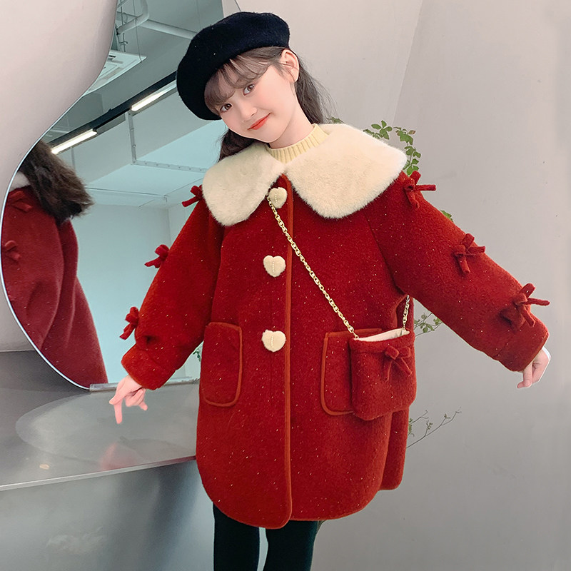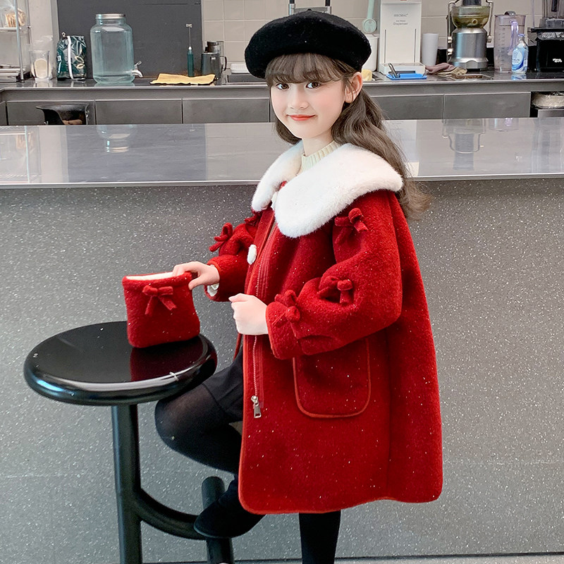 女童外套冬装2026新款儿童中长款加绒加厚毛呢红色大衣小女孩风衣