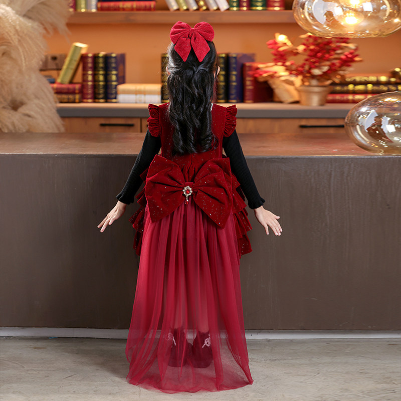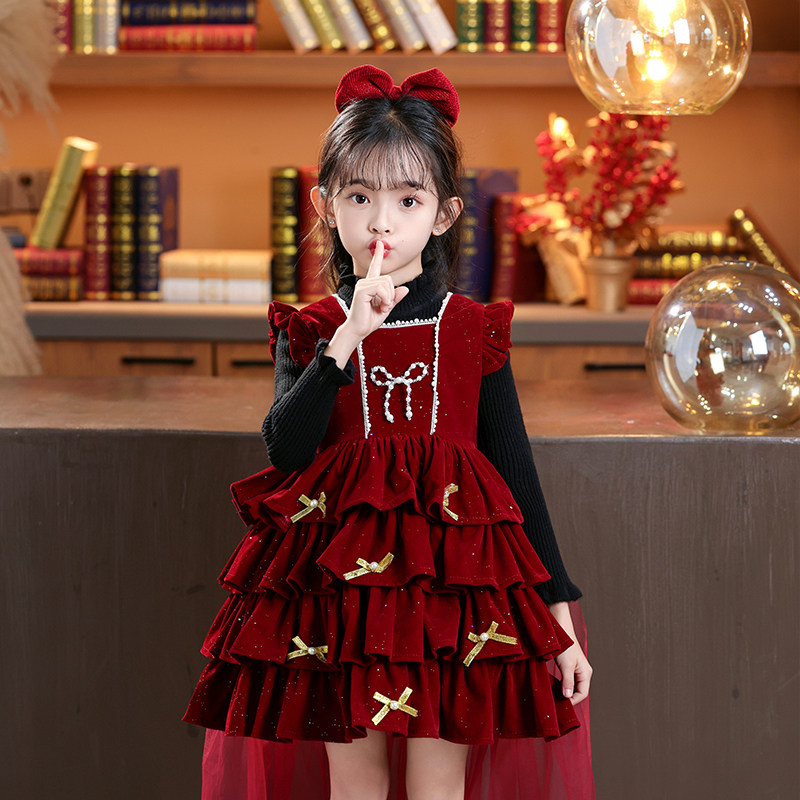 女童礼服花童婚礼公主裙加绒女孩儿童生日轻奢小众高端红色连衣裙