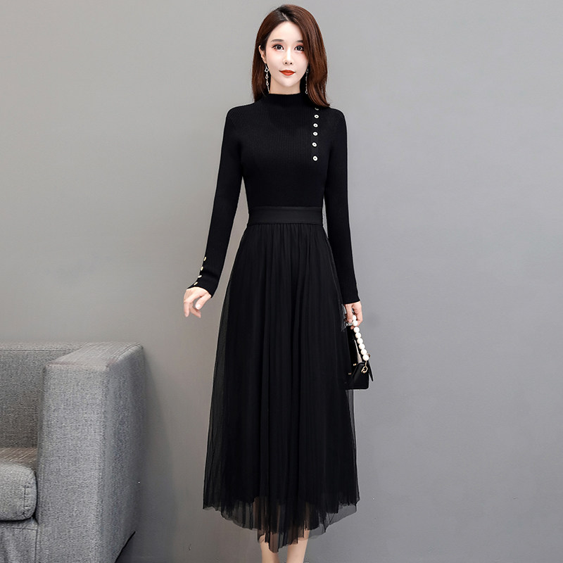 黑色毛衣针织连衣裙长款过膝网纱裙子高领加厚内搭打底长裙女秋冬