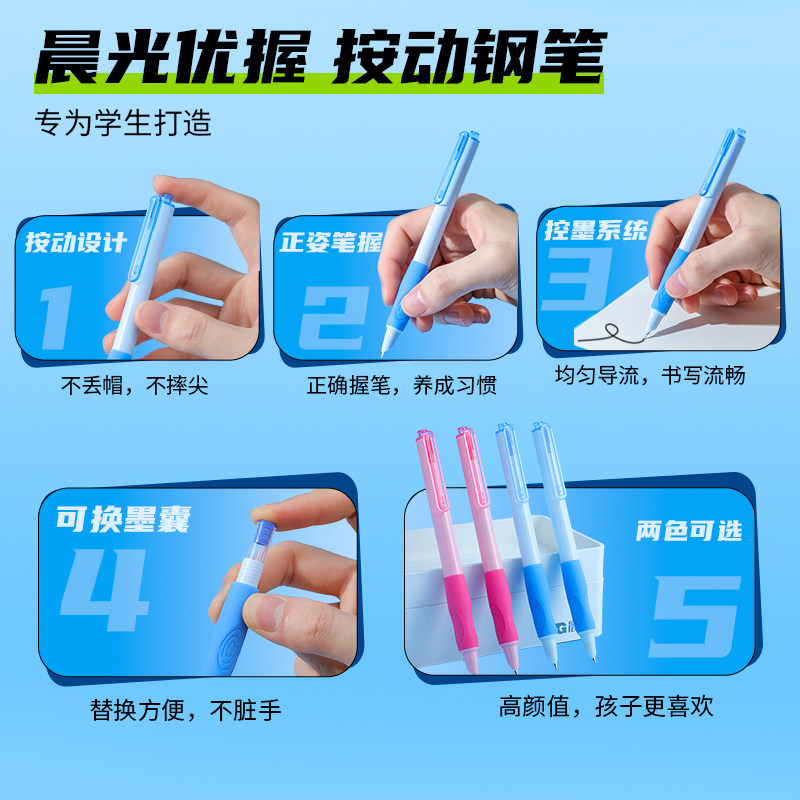 晨光文具优握按动钢笔按压式钢笔中小学生专用三年级字帖练字硬笔书法非热可擦钢笔暗尖儿童可换墨囊3.4口径