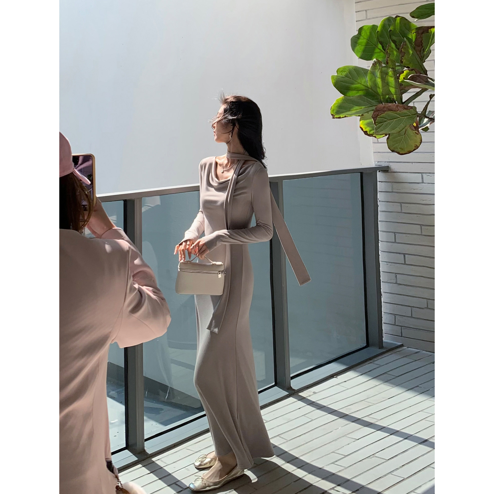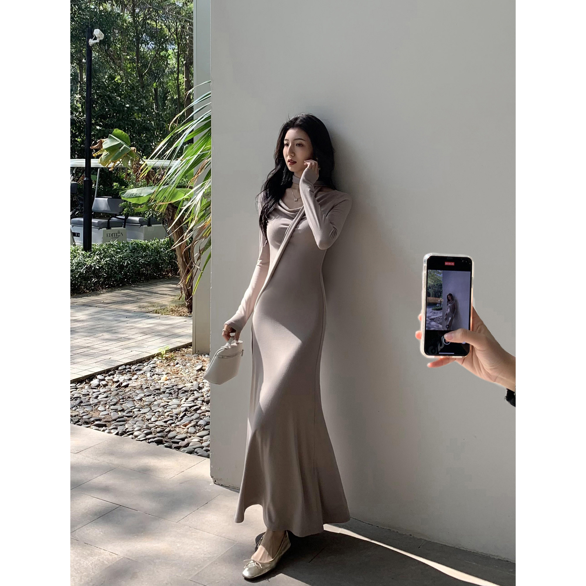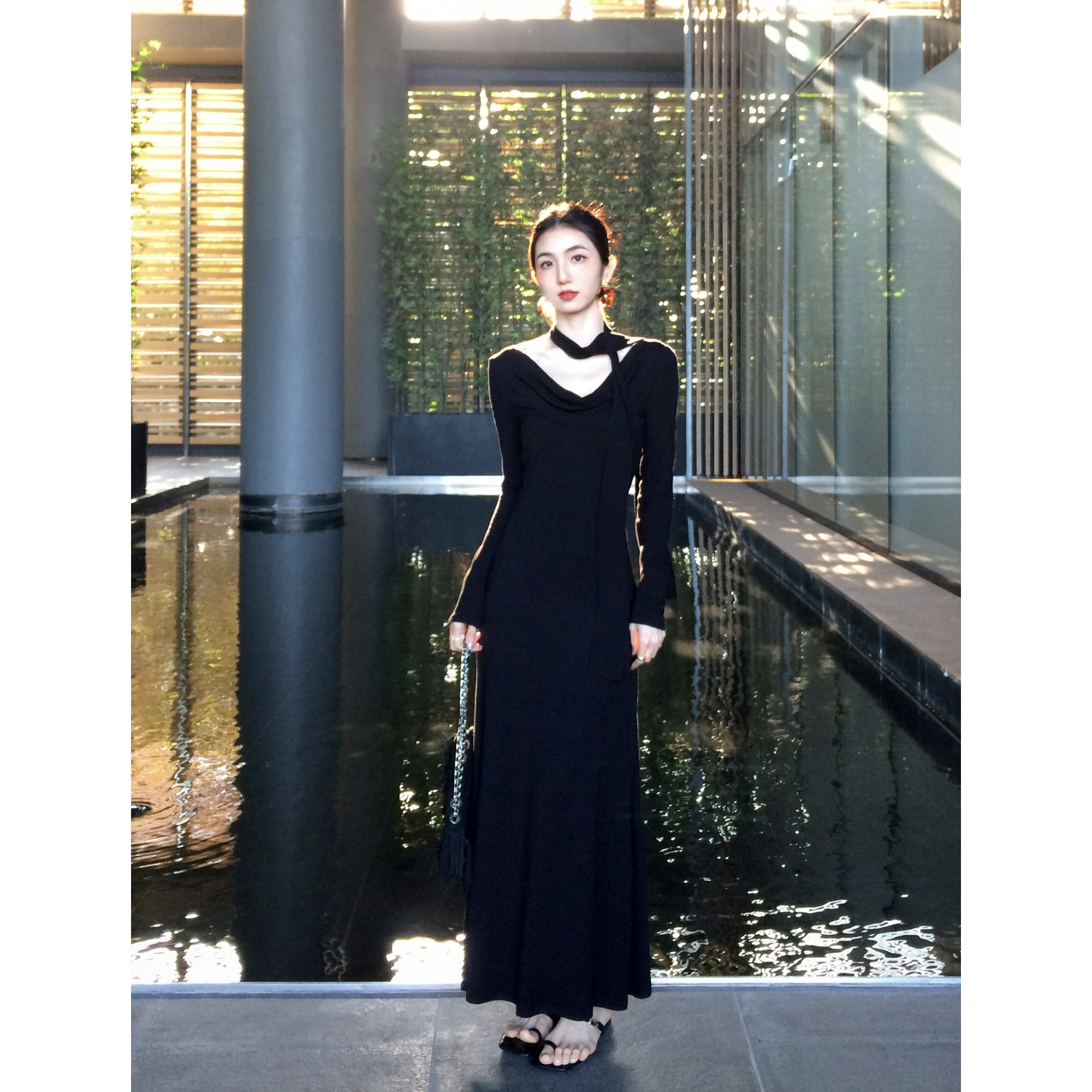 MULVAN 设计感荡领针织长袖连衣裙女修身气质飘带显瘦鱼尾长裙