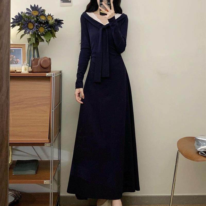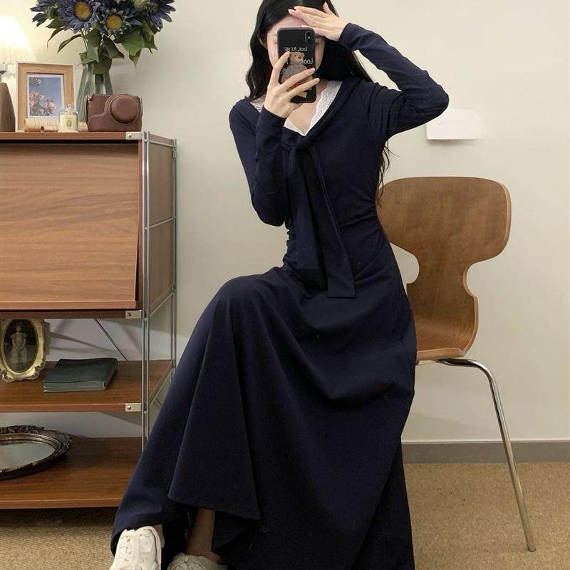 大码法式蕾丝V领绑带连衣裙女秋季胖MM高级感梨型身材内搭长裙子