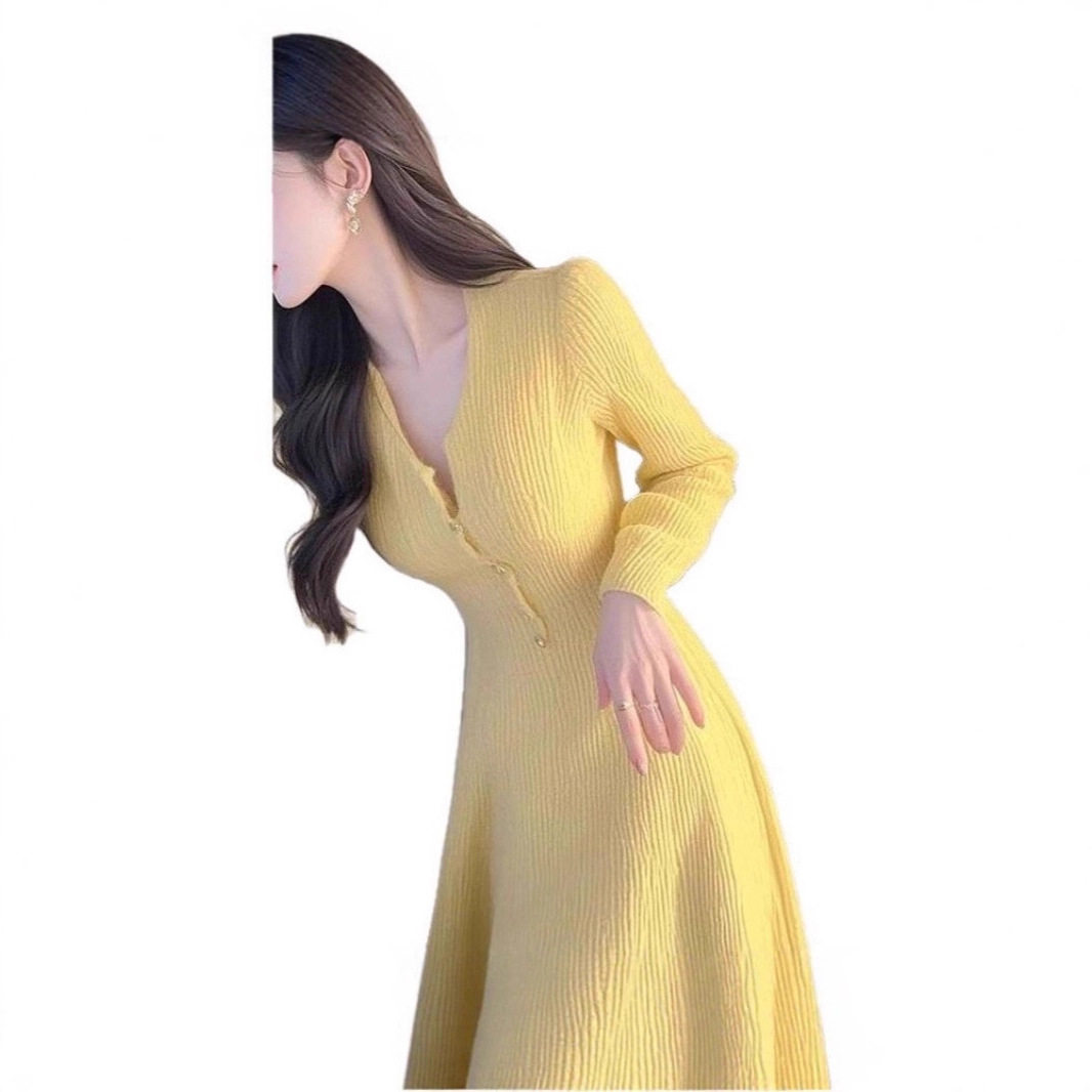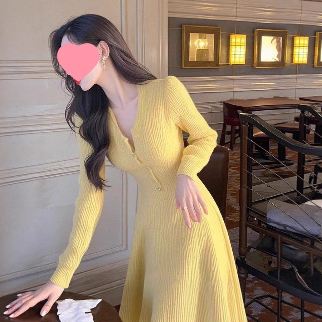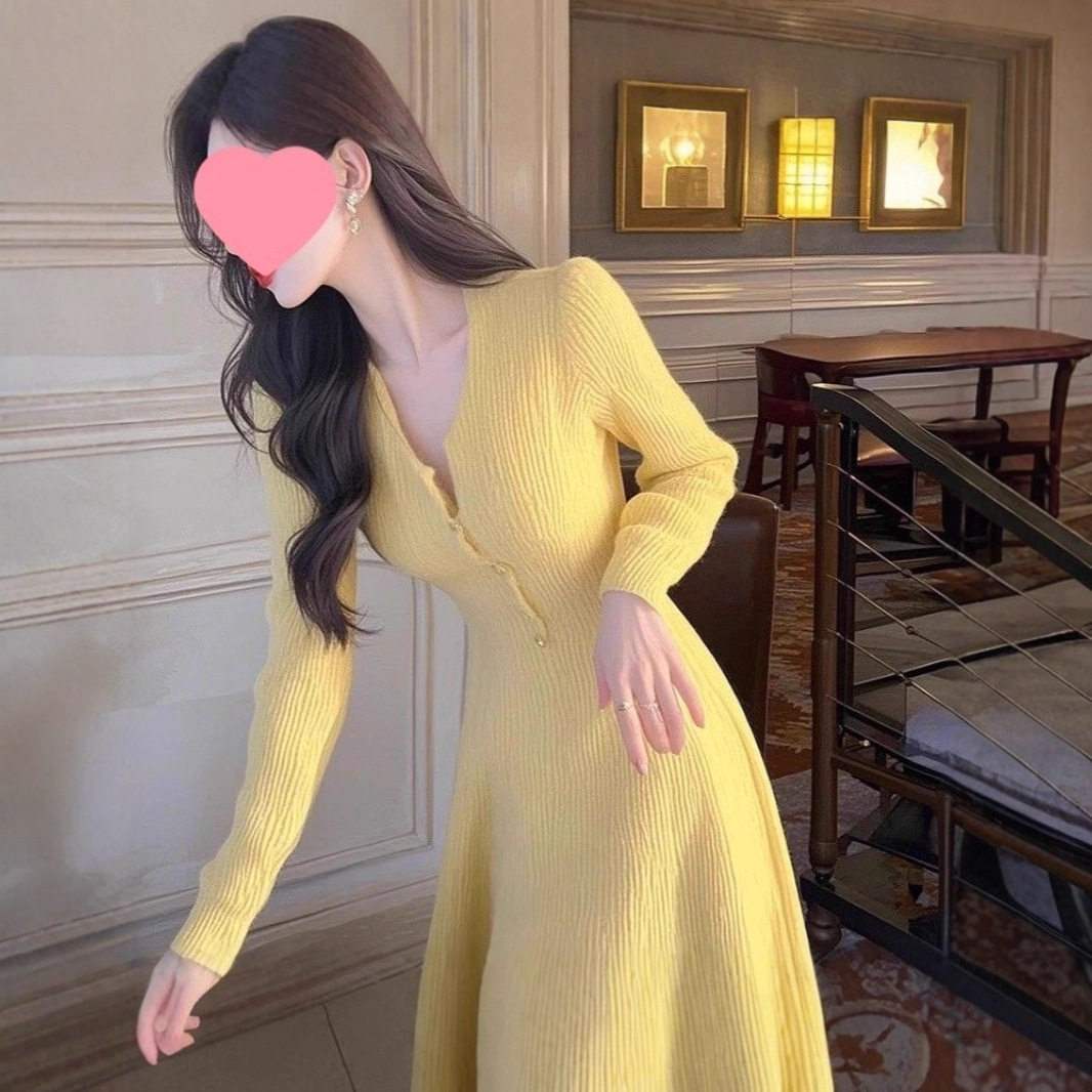 韩版黄色修身长袖针织连衣裙女秋季紧身气质长裙休闲收腰包臀裙子