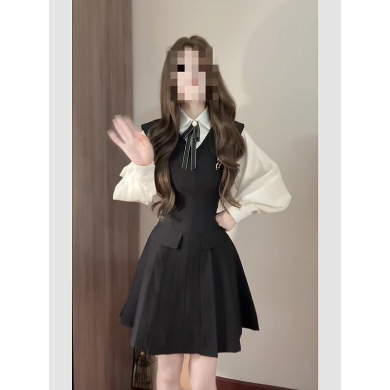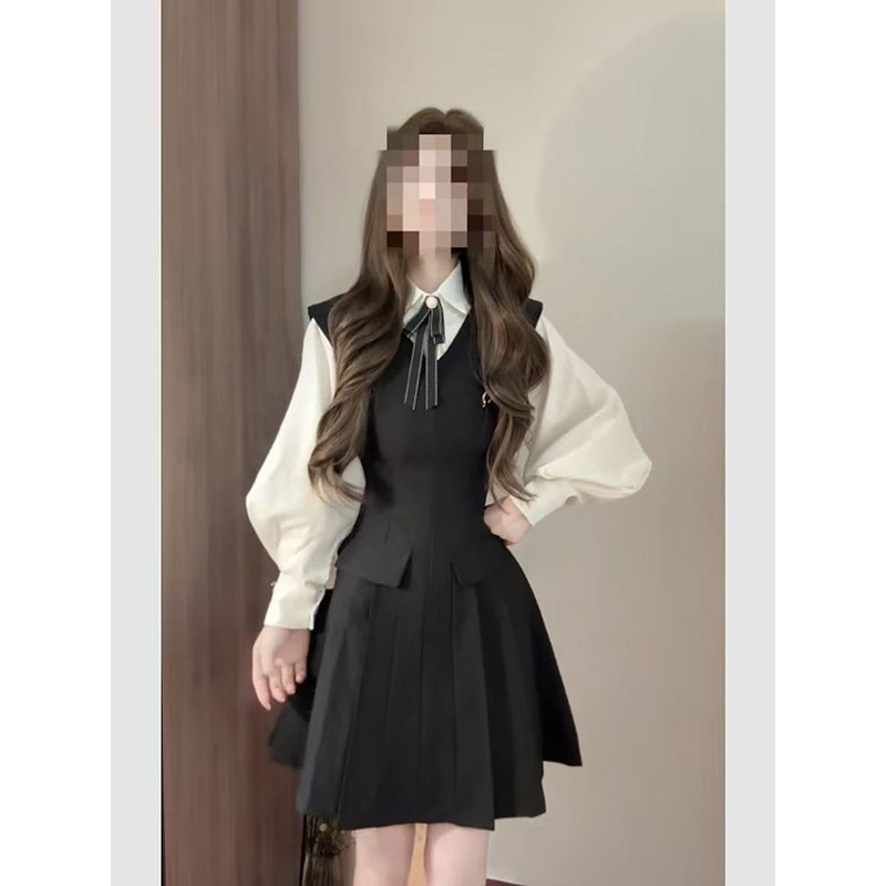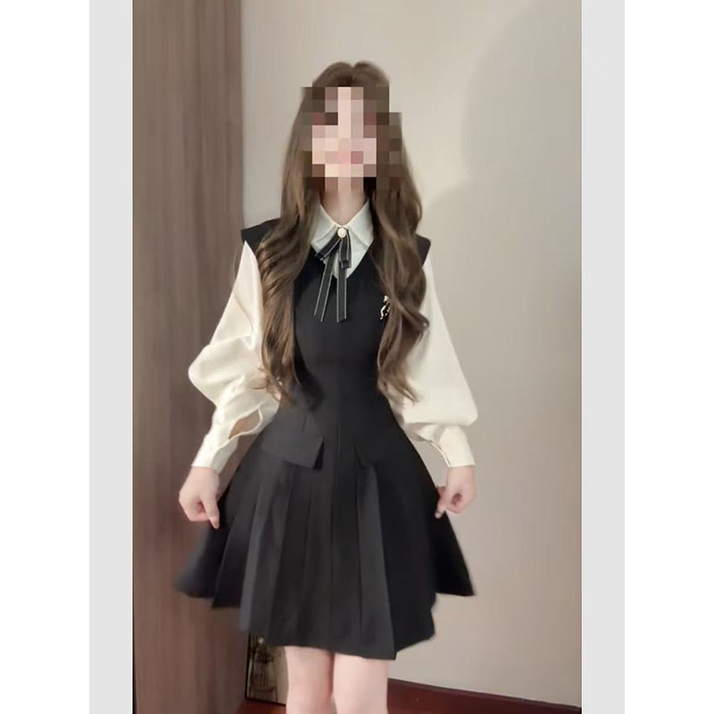 韩系气质减龄学院风白色长袖衬衫搭配黑色背心百褶连衣裙两件套装