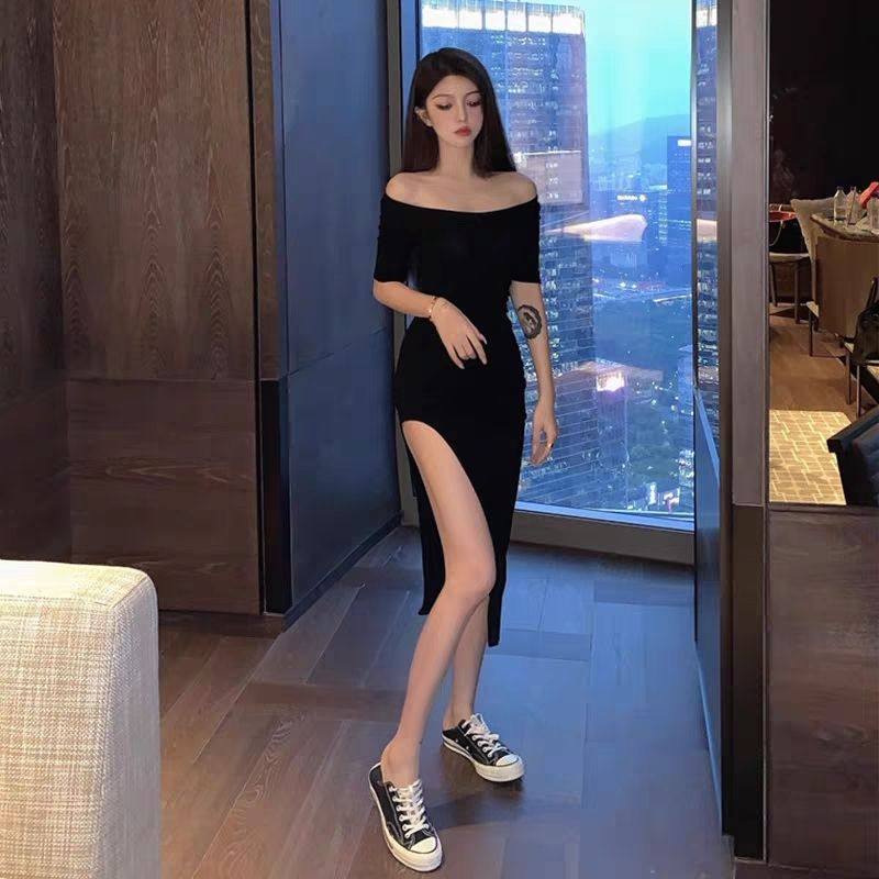 赫本风黑色性感一字肩开叉连衣裙中长款弹力紧身显瘦过膝长裙女夏