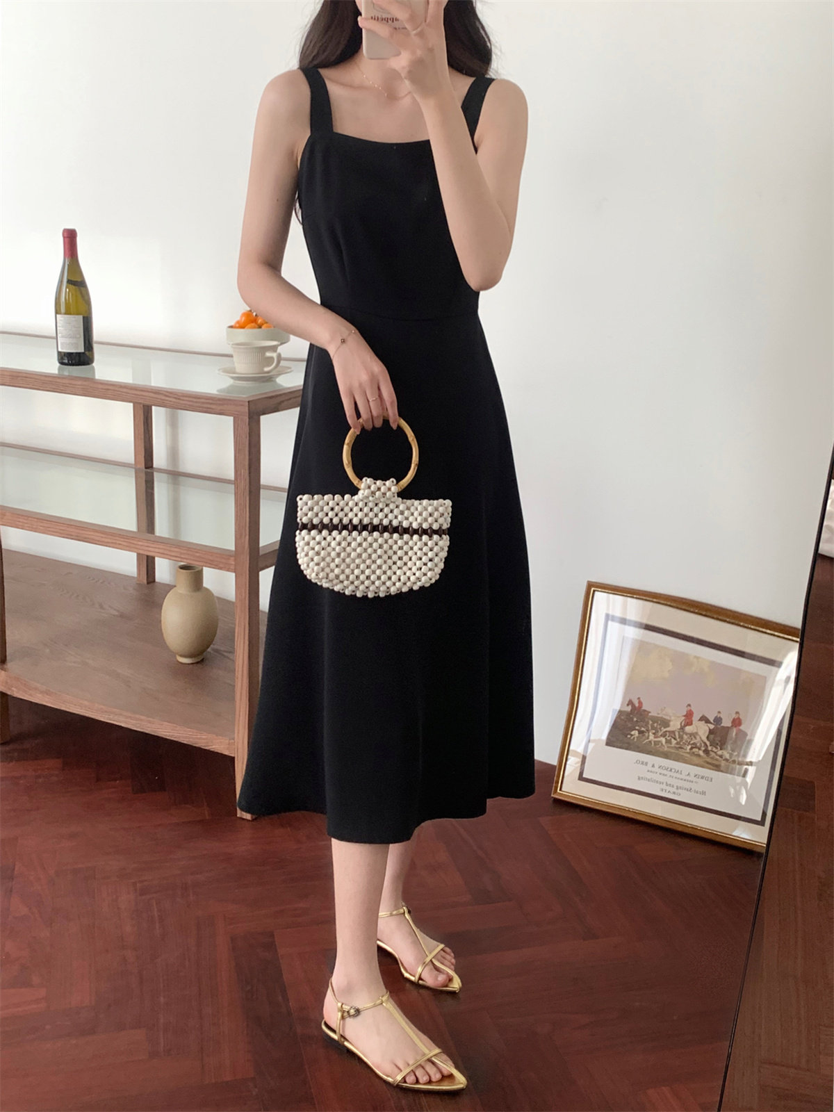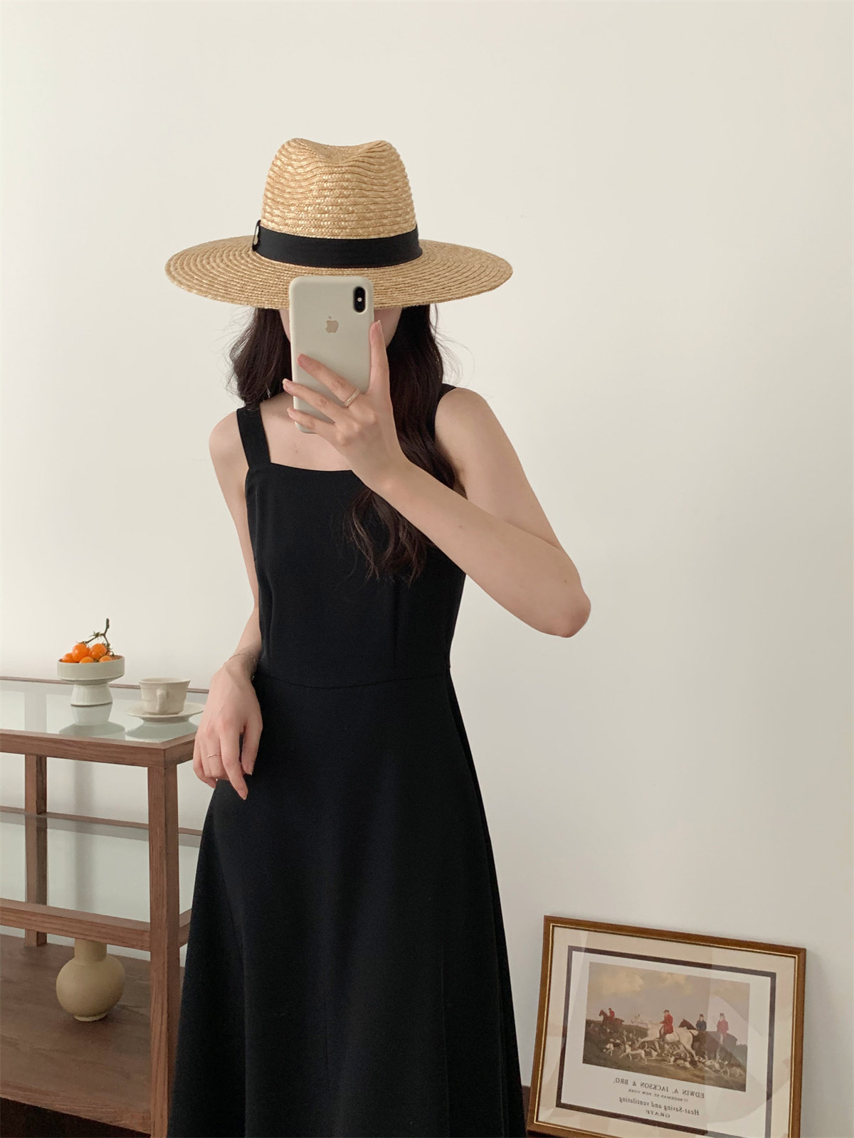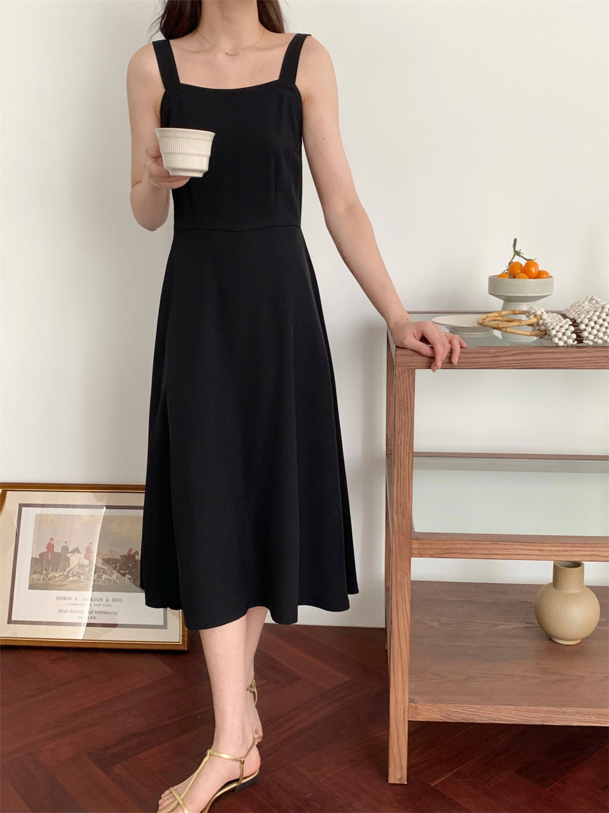 黑色西装裙方领吊带裙女2025春季新款气质连衣裙赫本风小个子长裙