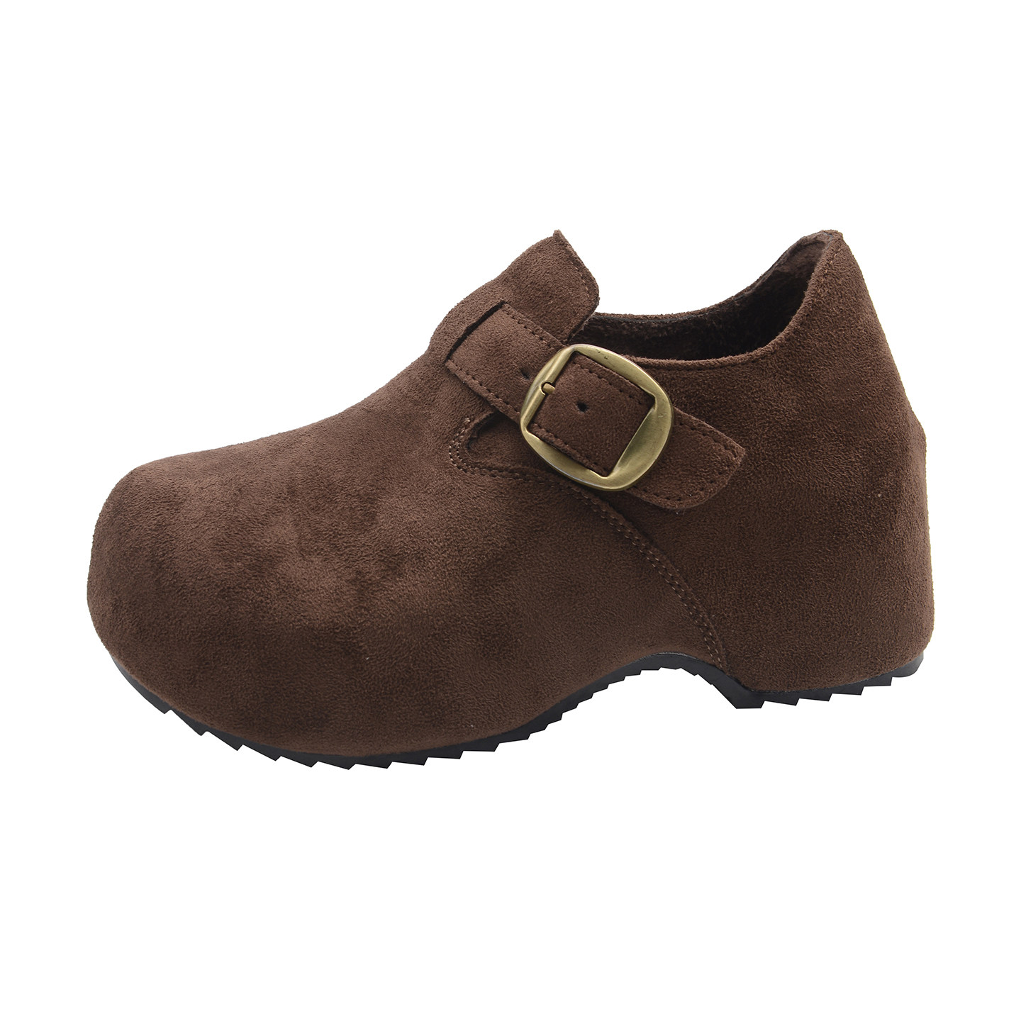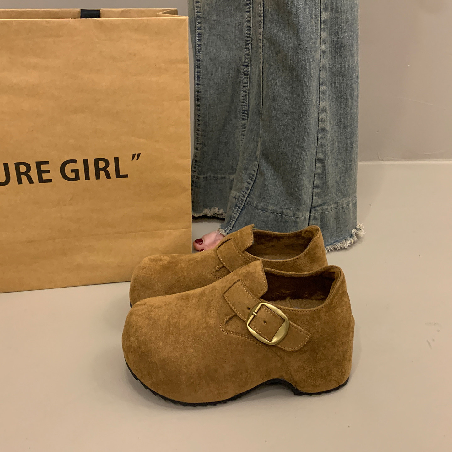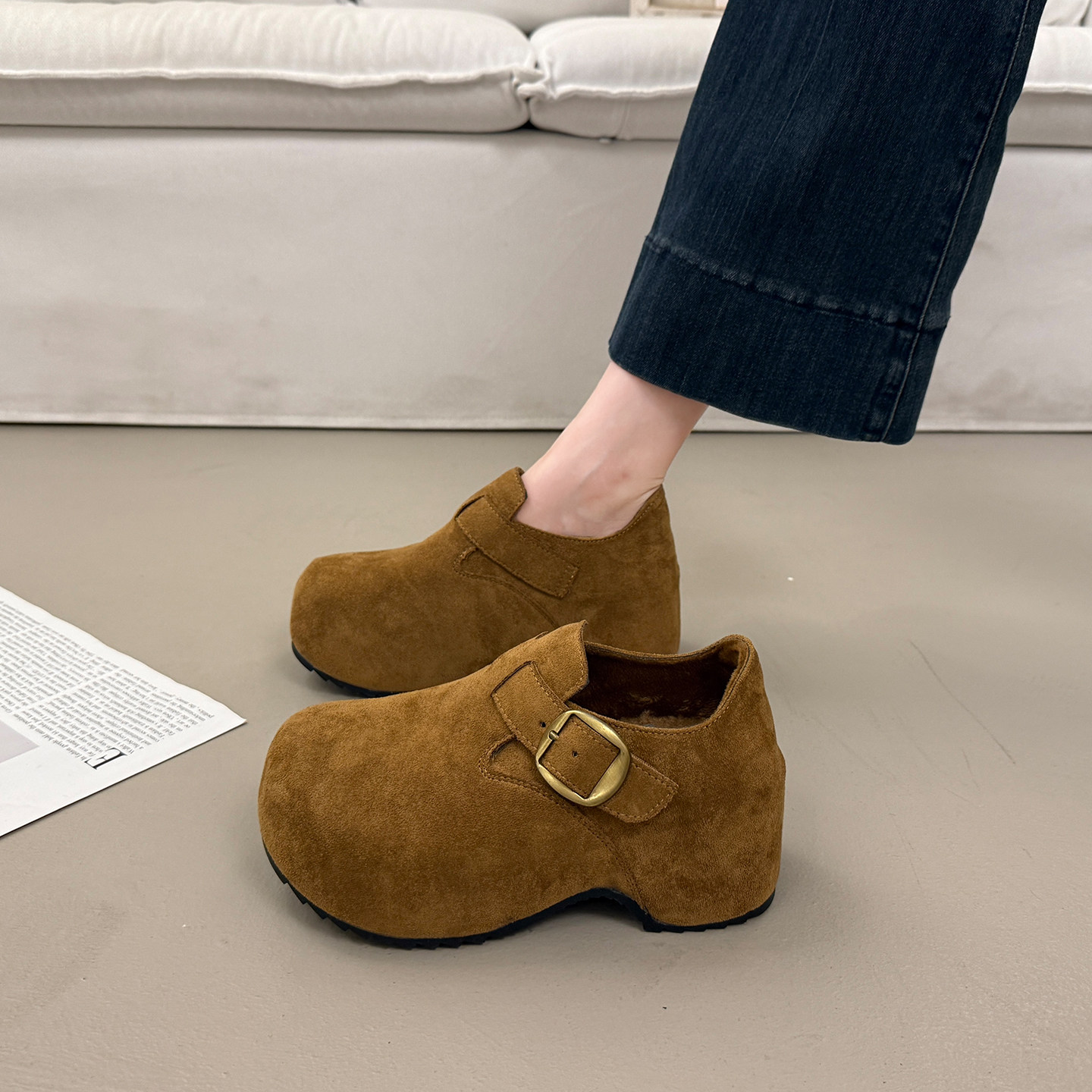 加绒厚底勃肯鞋毛绒女冬季高跟深口单鞋2025新款爆款内增高坡跟鞋