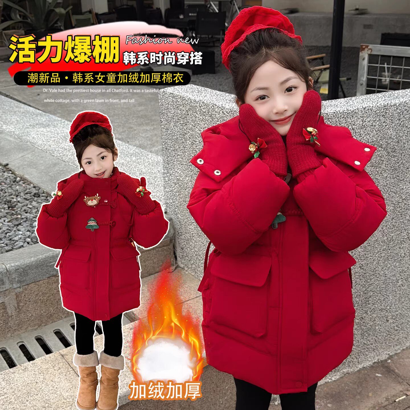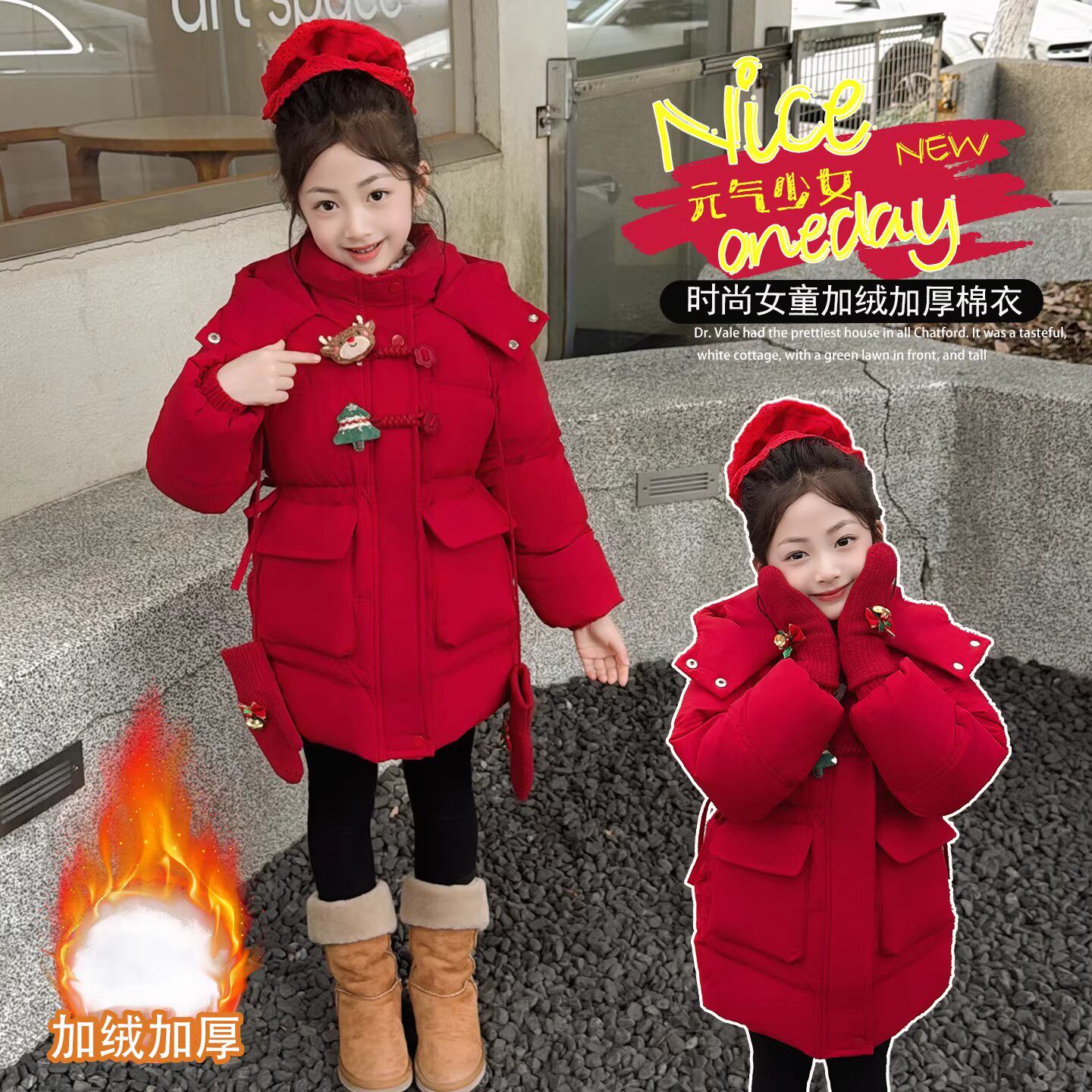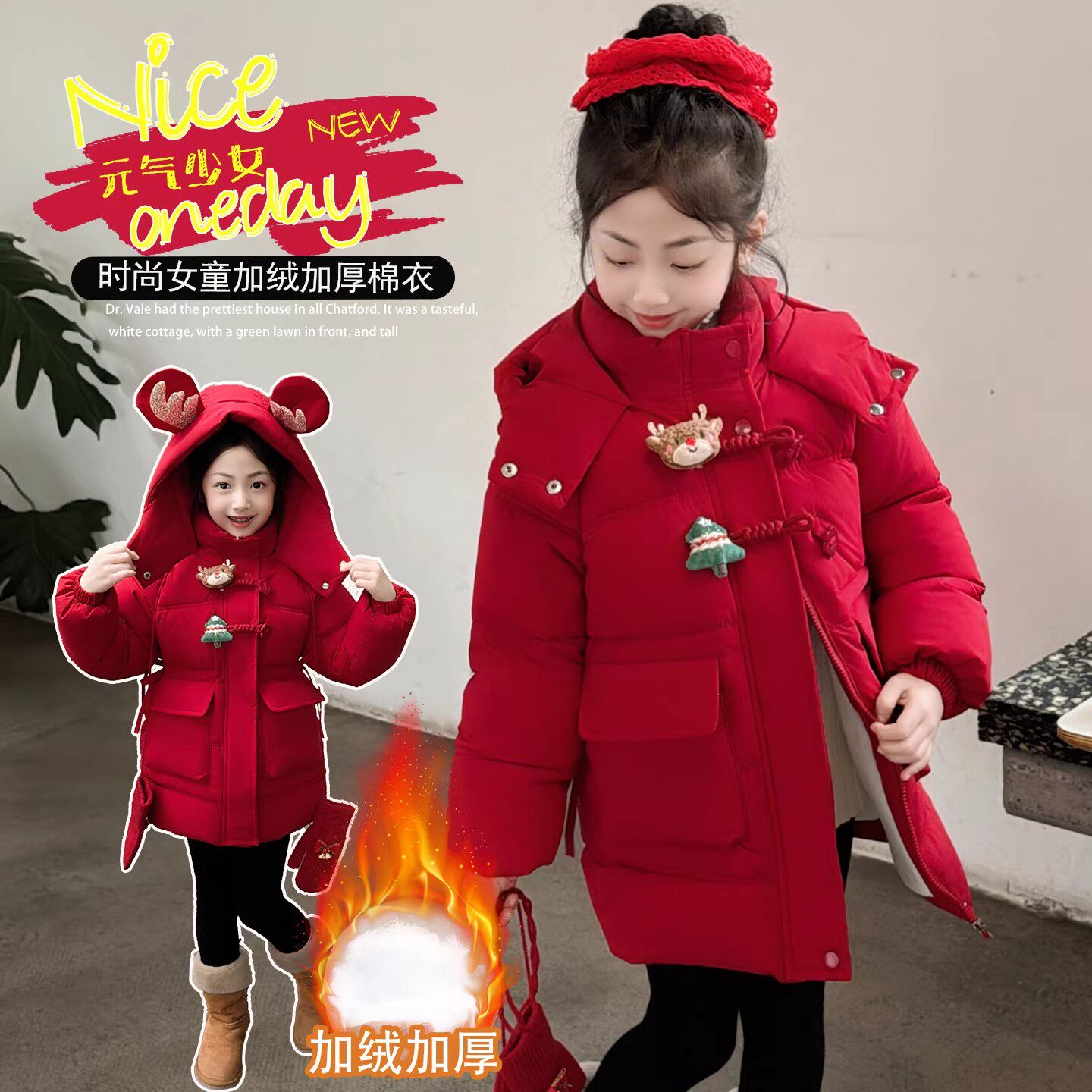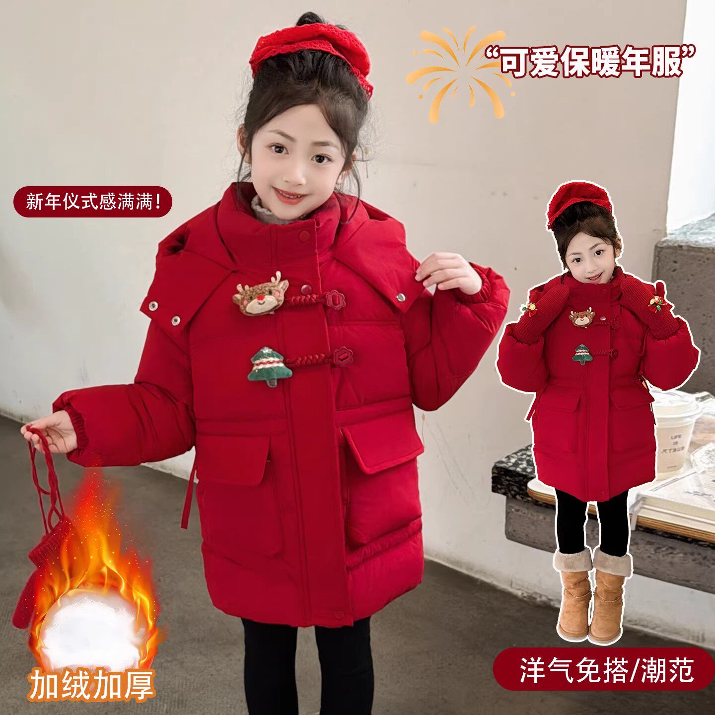 QKIKT女童红色棉服2026新款韩系冬季中长款加绒加厚过膝连帽外套