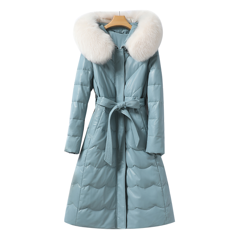 海宁皮羽绒服女中长款系带连帽狐狸毛领绵羊皮外套新款真皮女皮衣