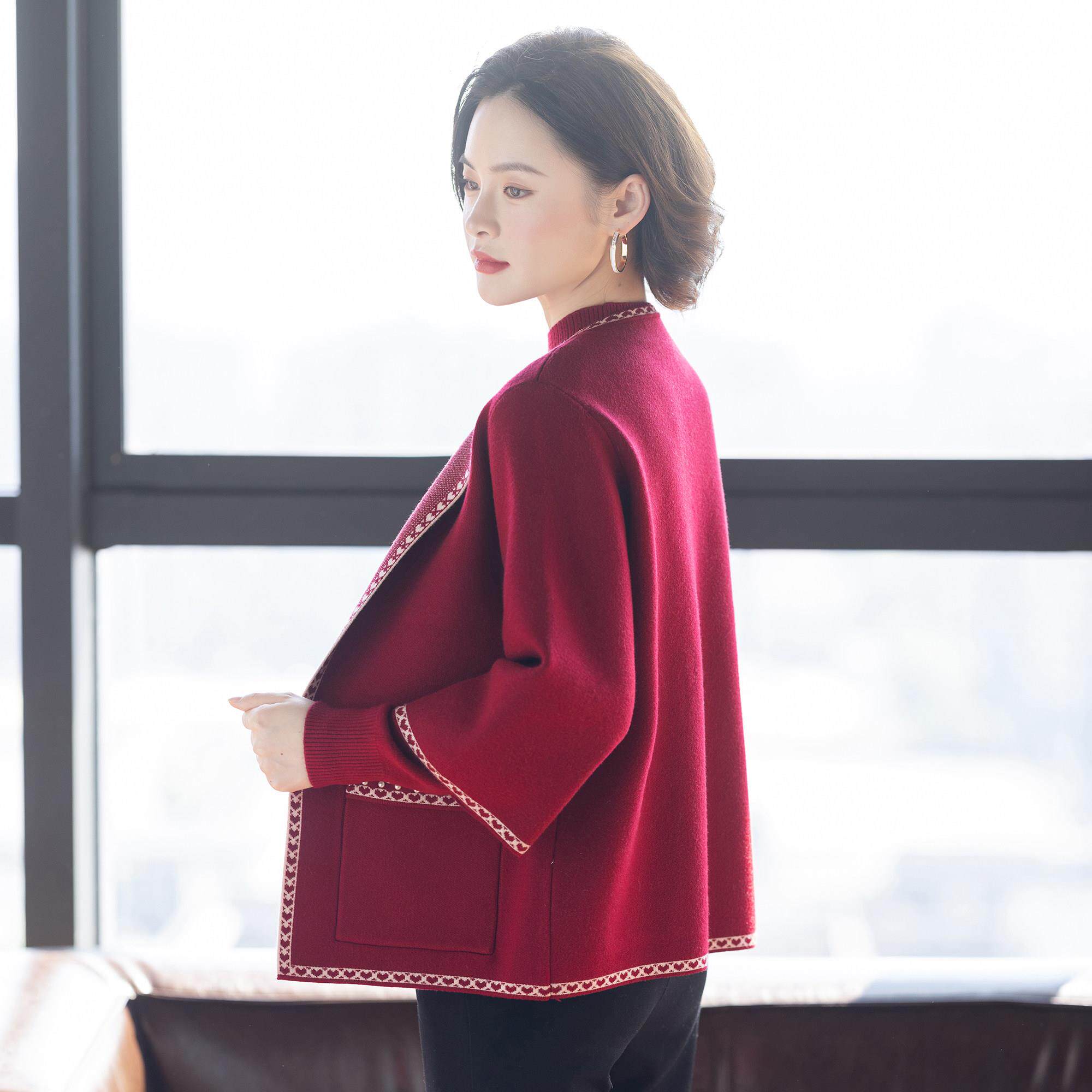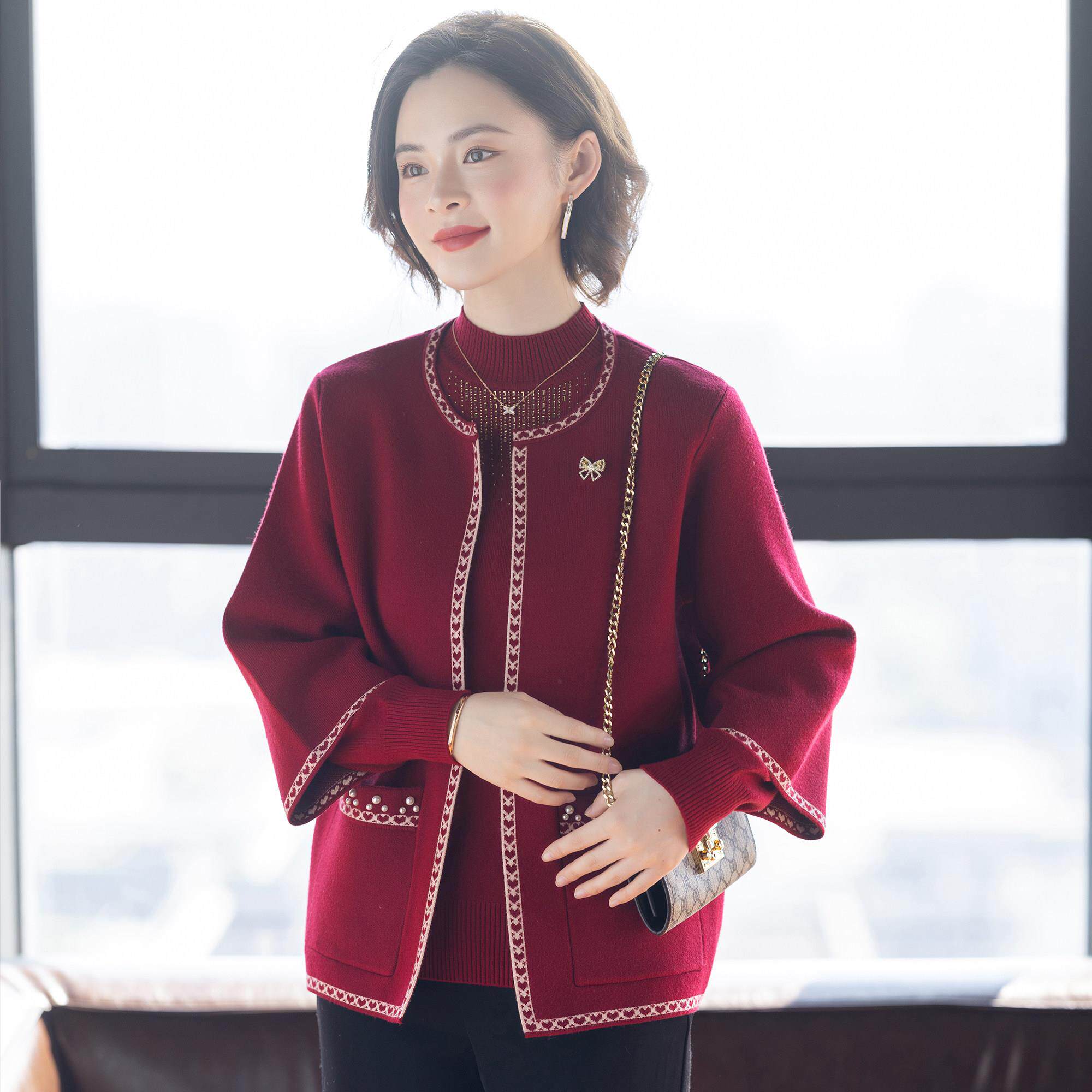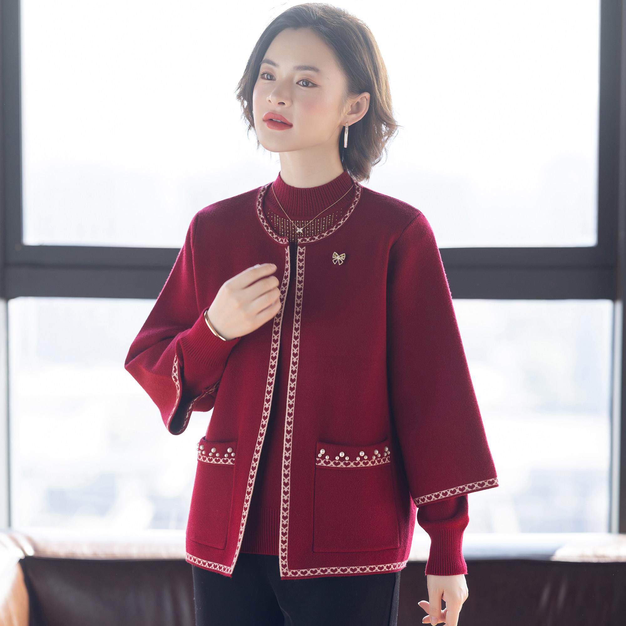 妈妈冬装两件套装毛衣外套2025新款喜婆婆婚宴中老年女红色上衣服