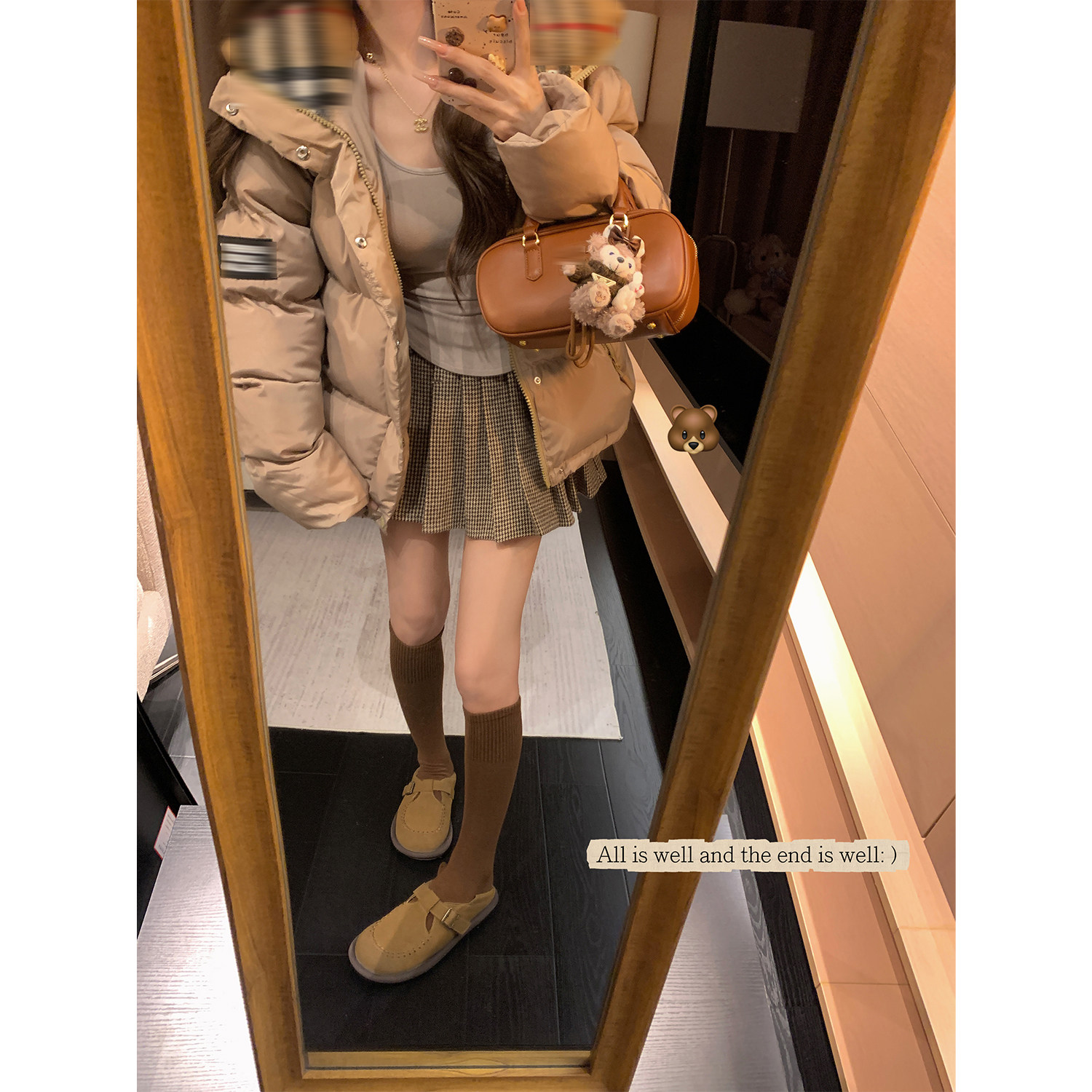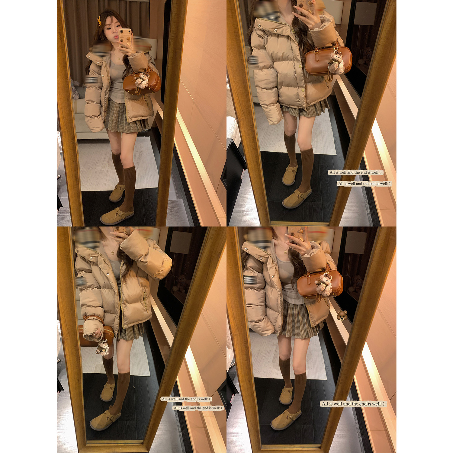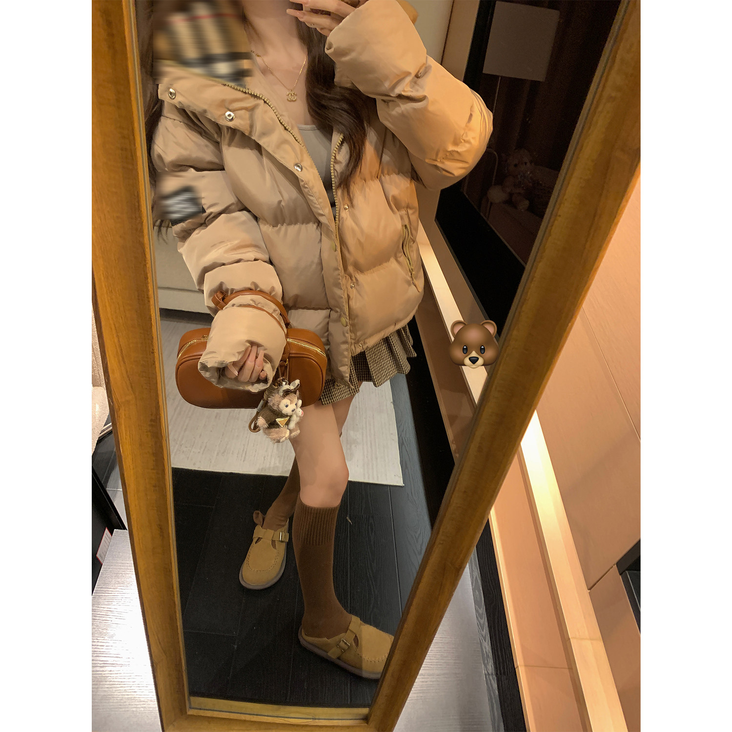 DDXZ夕子格子拼接连帽卡其色棉服冬季短款小个子加厚保暖女款外套